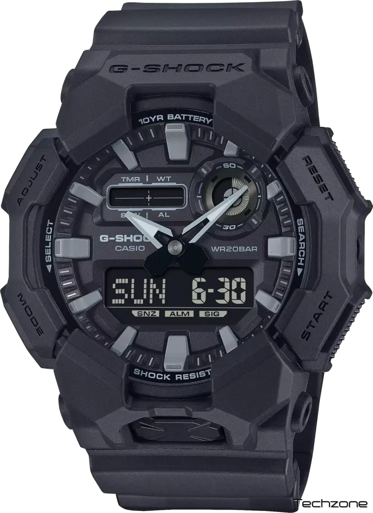 У чорному годиннику G-SHOCK з великим корпусом і 10-річною батареєю вам не доведеться турбуватися цілу вічність. Аналогово-цифровий годинник GA-010 має такі зручні функції, як світовий час і секундомір, має великий дисплей, який легко читається, і великий корпус. Кнопка на передній панелі спрощує доступ до світлодіодного підсвічування високої яскравості, так що ви зможете легко читати циферблат навіть у темряві. Годинник G-SHOCK виготовлено з біополімеру й оснащено 10-річним акумулятором, що робить його екологічно чистим і модним. Цей чорний годинник можна з легкістю використовувати як у повсякденному житті, так і на роботі.