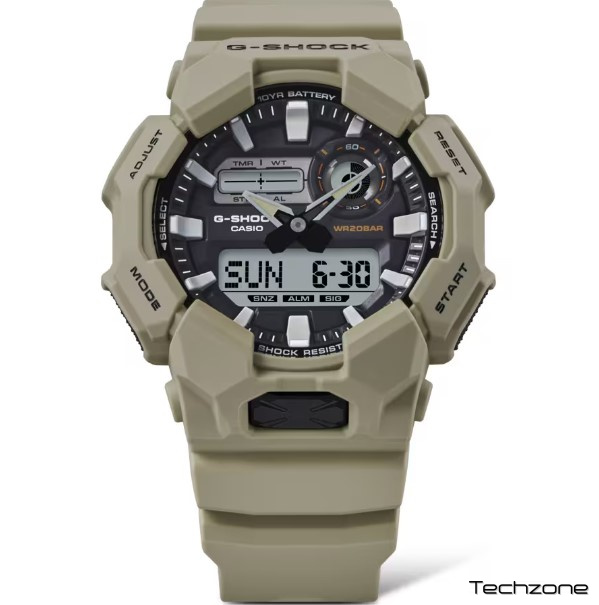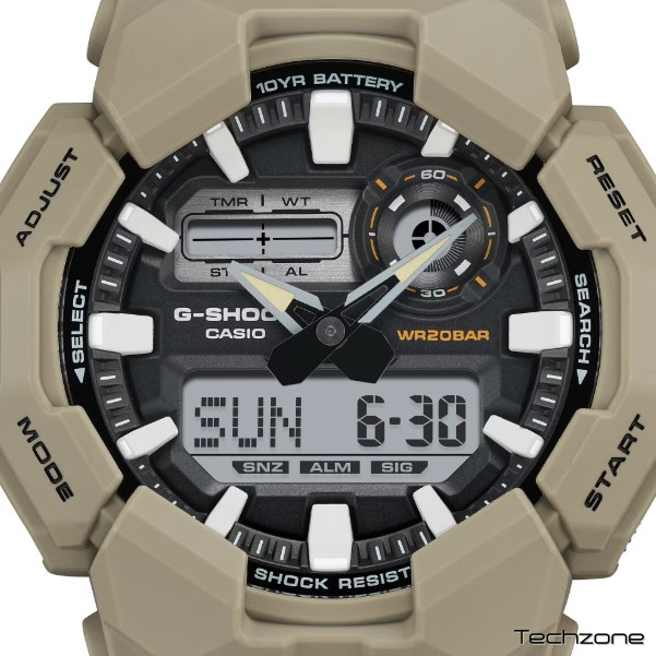 Аналогово-цифровий GA-010 пропонує зручні функції, такі як світовий час і секундомір, а також яскравий світлодіодний індикатор, який легко активується за допомогою великої кнопки на передній панелі корпусу, що забезпечує видимість навіть у темряві.