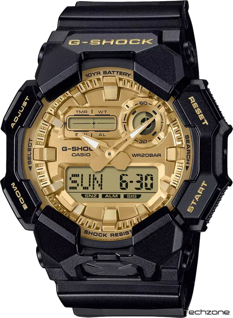 Або оберіть годинник з характерним дизайном великого циферблата — GA-010GB-1A9 з індексами, обробленими золотистим напиленням парової фарби, або GD-010GB-1A9 з периметральним кільцем РК-дисплея, обробленим золотистим напиленням парової фарби.
