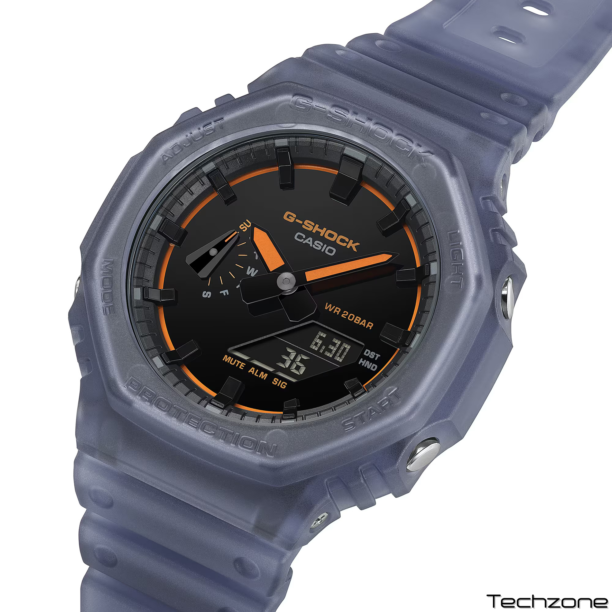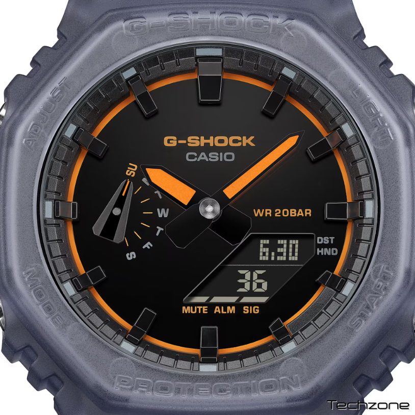 Новорозроблене покриття поверхні надає циферблату чистого вигляду, який ідеально доповнює обтічний дизайн годинників GA-2100. Ця гладка поверхня є ідеальним полотном для глянцевого покриття та насиченої кольорової гами, яка проектує неймовірну глибину чорного кольору рояля.