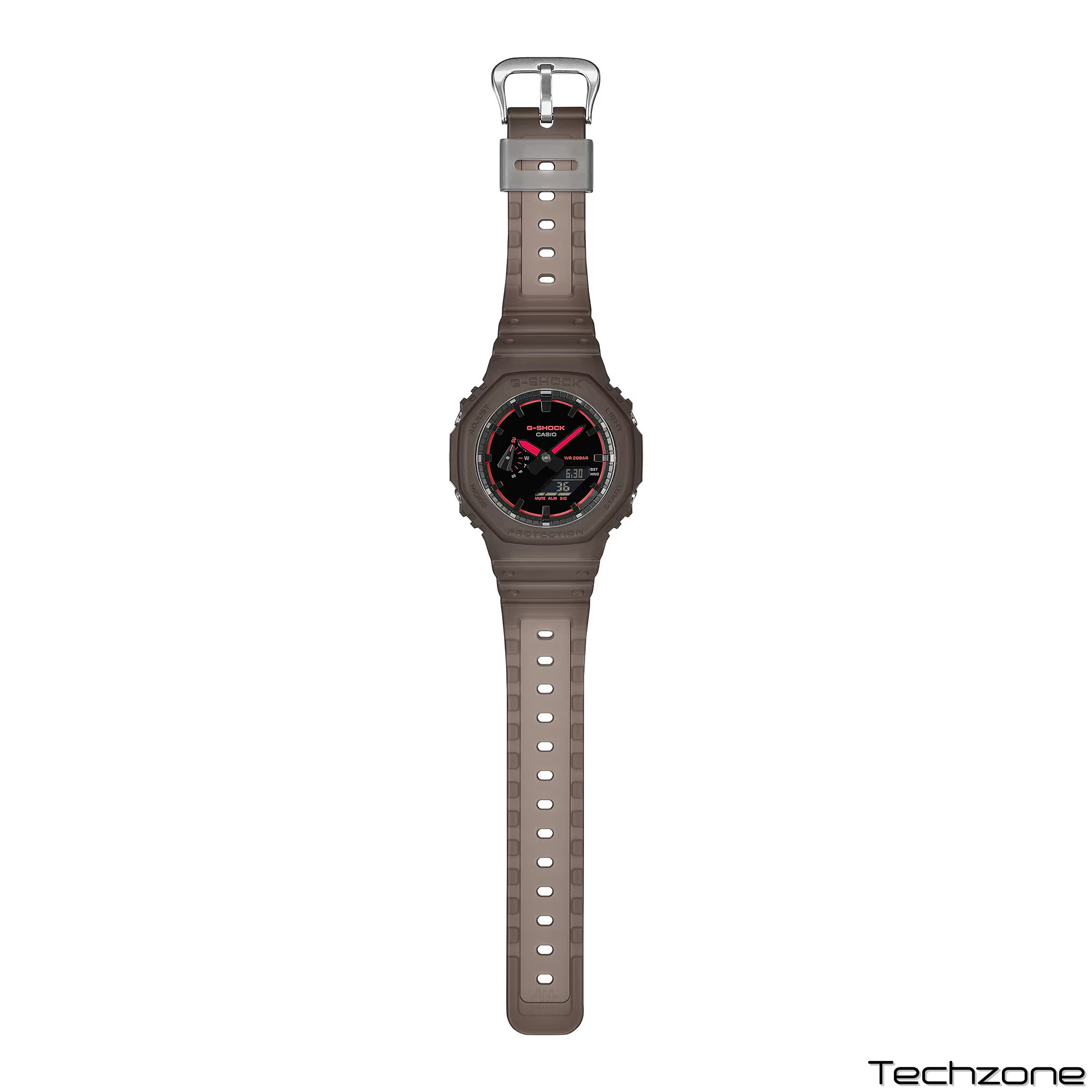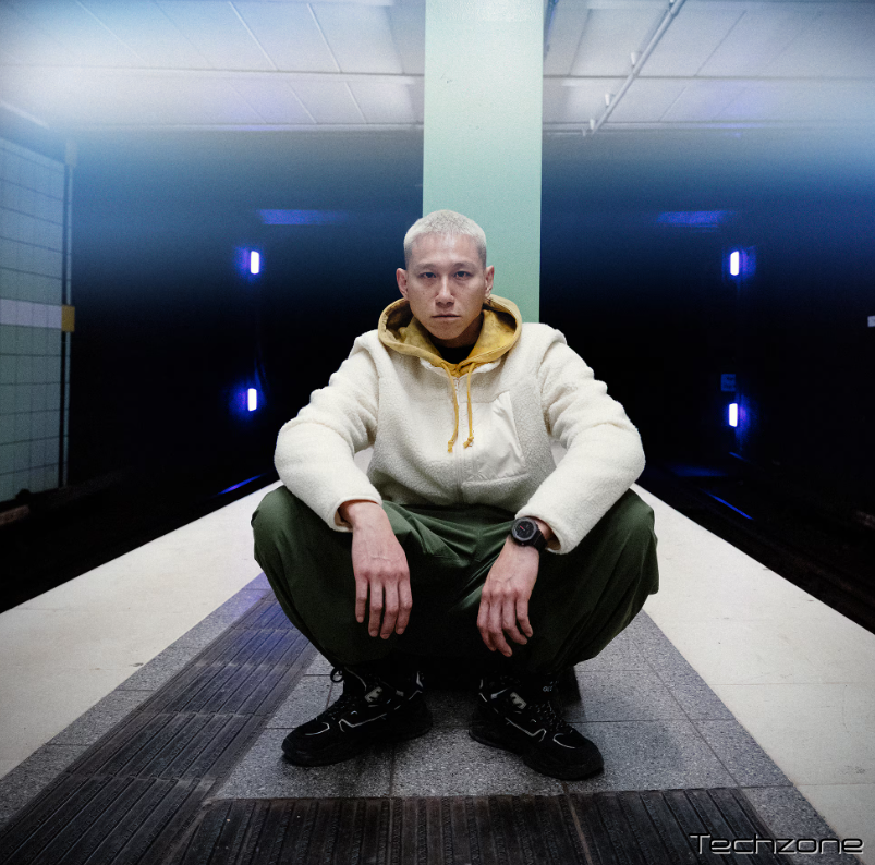 Контрастні текстури та тони по всьому годиннику перегукуються з нічною музичною сценою. Неонові акценти сяють, як лазерні спалахи, а матовий, напівпрозорий безель та ремінець створюють тактильні відчуття, що нагадують імлу танцполу, що ширяє від дим-генератора.