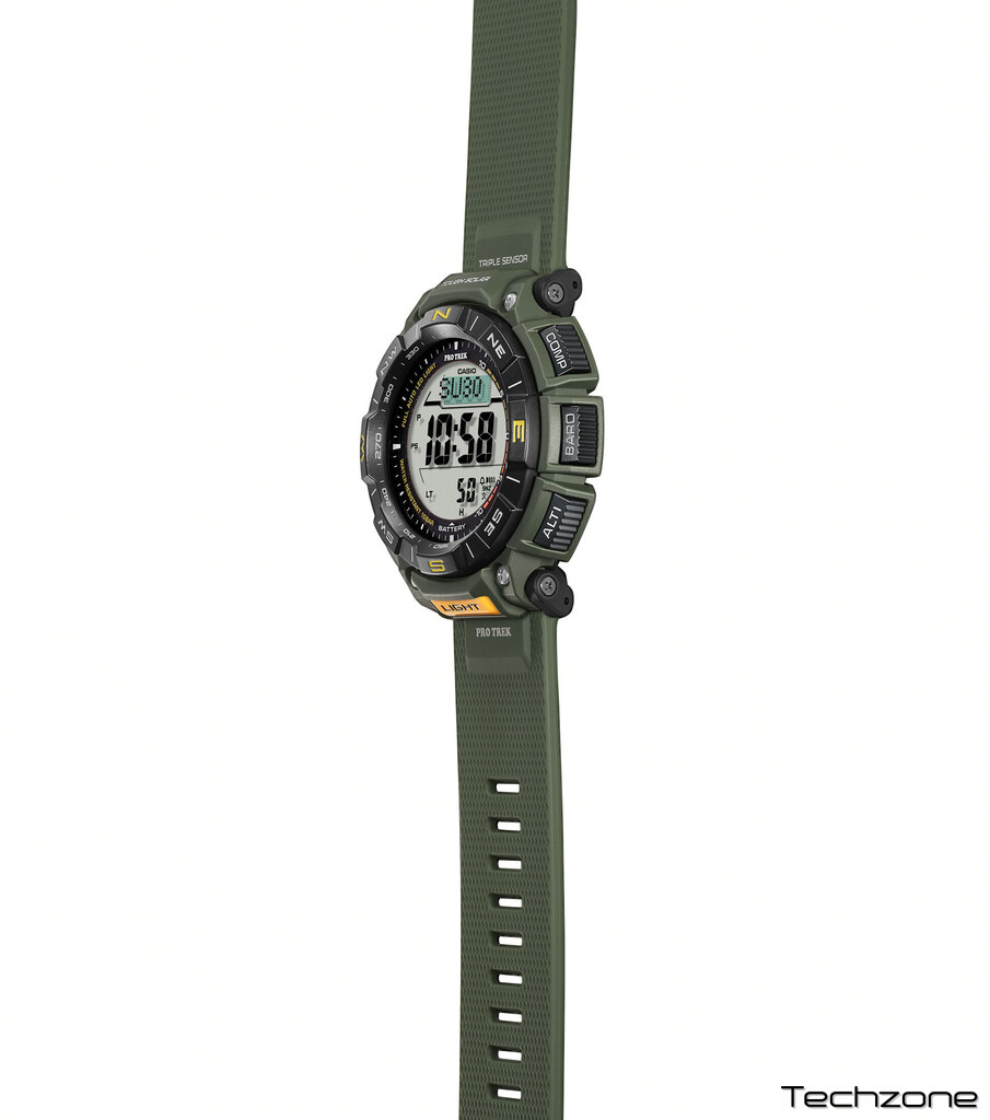 Цей чоловічий годинник Casio Pro Trek являє собою круглий полімерний корпус із зеленим кольором і мінеральним склом. Він оснащений кварцовим механізмом з підсвічуванням, барометром, тактичними функціями, будильником і автоматичним календарем. Водонепроникність 100 WR і гарантія 24 місяці роблять цей годинник ідеальним для активних чоловіків.