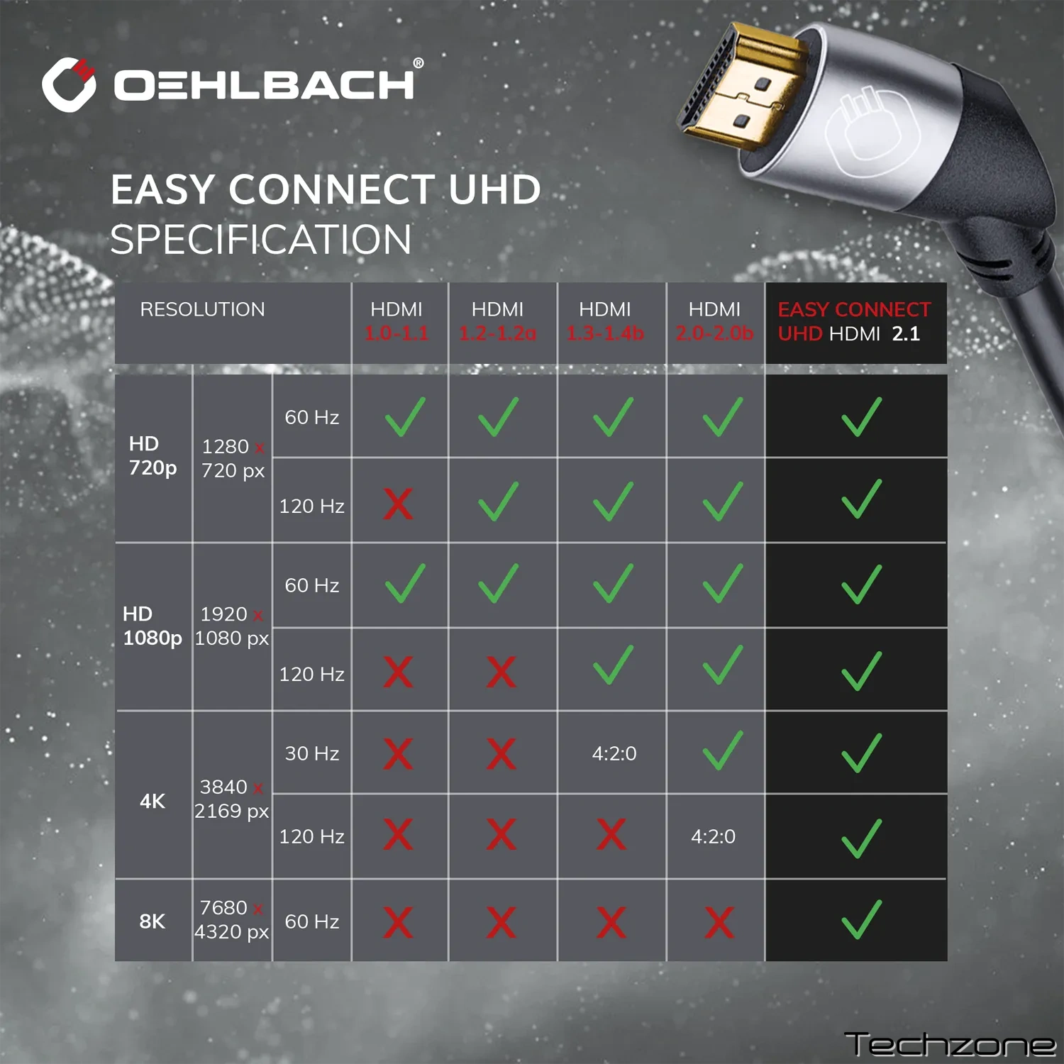 Кабель 8K Ultra High Speed HDMI забезпечує високу якість передачі даних у нові домашні розваги та забезпечує швидкість передачі даних до 48 Гбіт/с для повної пропускної здатності сучасних сигналів Ultra HD 8K (до 60 Гц) та 4K (до 120 Гц). 3D-звукові формати Dolby Atmos та DTS передаються без втрат за допомогою Easy Connect UHD до підключеного AV-пристрою. Міцні роз'єми під кутом 40° (бічні сторони розташовані дзеркально, див. фото) гарантують максимальну стабільність сигналу, внутрішній провідник виготовлений з безкисневої міді (OFC), а кабель має потрійне екранування, що забезпечує високоякісний захист від перешкод.