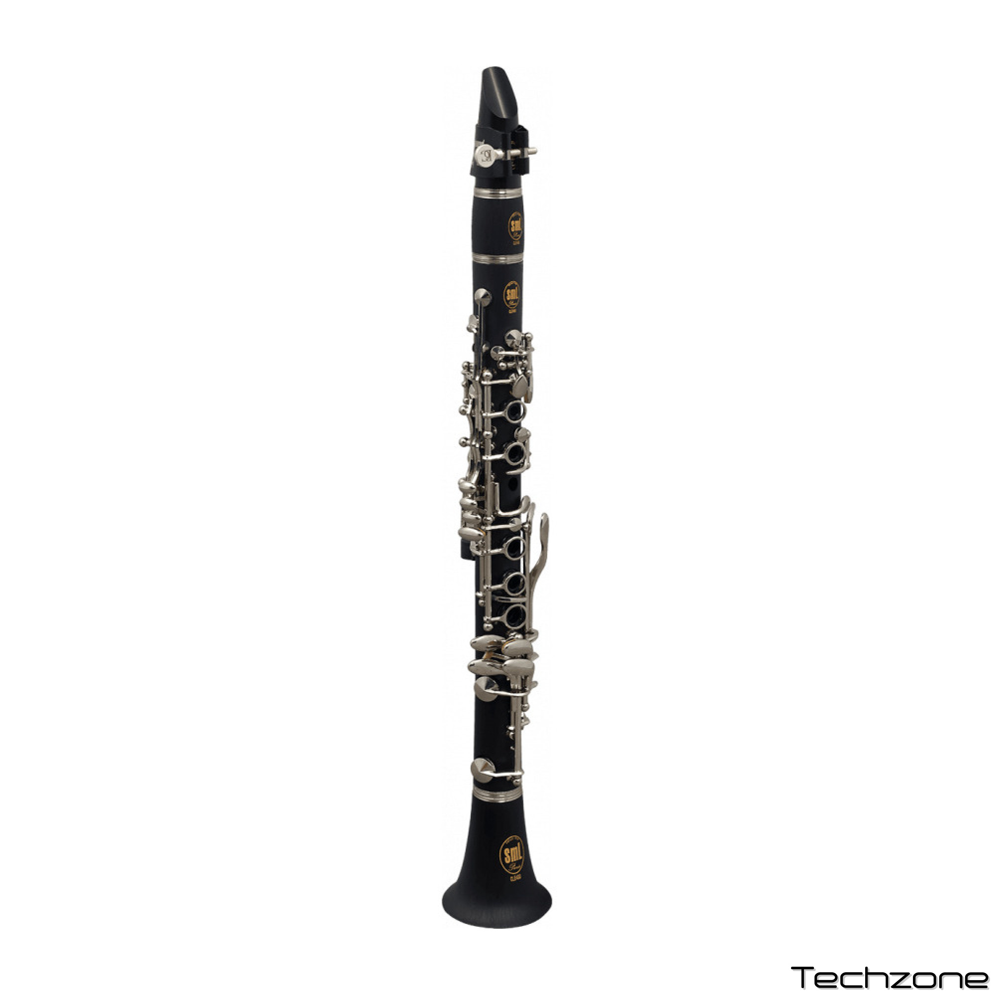 Корпус кларнета изготовлен из прочного ABS-пластика, что делает его устойчивым к изменениям температуры и влажности, а также обеспечивает легкость в уходе. Инструмент оснащен механикой системы Бёма (Boehm) на 17 клапанов и 6 колец, изготовленной из посеребренного нейзильбера. Это придает не только элегантный вид, но и обеспечивает плавный и точный ход клапанов. Для максимального удобства предусмотрен регулируемый упор для большого пальца, позволяющий настроить инструмент под индивидуальную анатомию музыканта.
