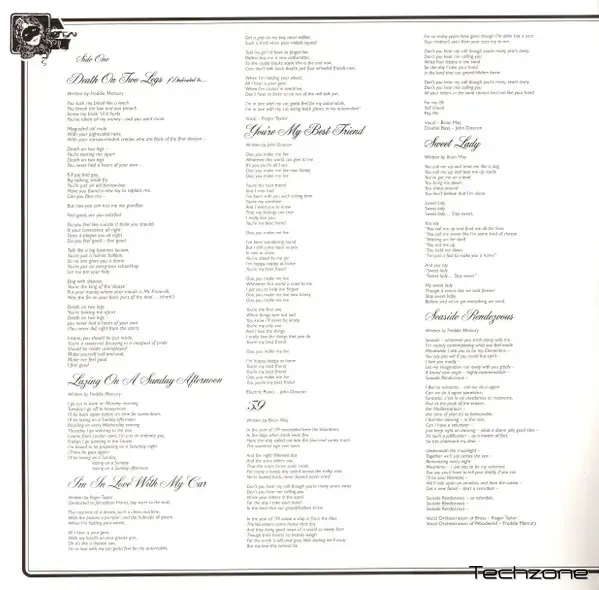 | A7 | Seaside Rendezvous Vocals [Vocal Orchestration Of Brass] – Roger Taylor Written-By, Vocals [Vocal Orchestration Of Woodwind] – Freddie Mercury | |