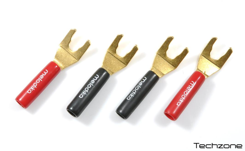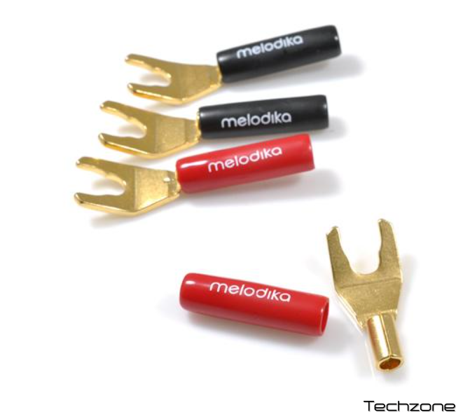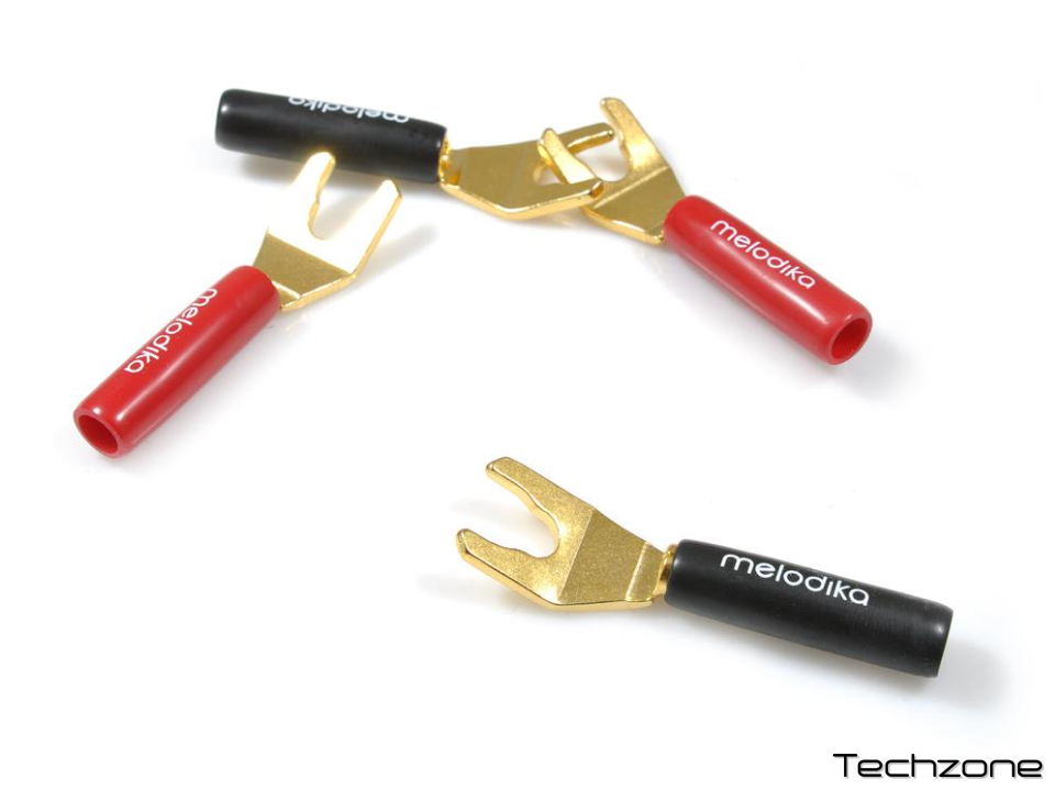 Melodika MDSPA4 — це якісні розгалужувачі типу "вилка", призначені для надійного підключення акустичних кабелів до клем підсилювача або колонок. Виготовлені повністю з металу, вони мають антикорозійне покриття із 24-каратного золота, що забезпечує стабільний контакт і мінімізує втрати сигналу. Завдяки універсальній конструкції можуть монтуватися як методом пайки, так і за допомогою обтиску, що дозволяє адаптувати їх під різні типи кабелів.