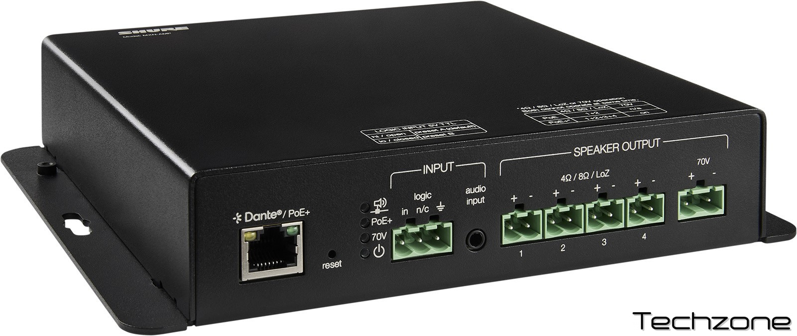 Пристрій підтримує живлення через PoE+, що дозволяє уникнути додаткового джерела живлення. Має чотири входи та чотири виходи Dante, а також аналоговий стереовхід 3,5 мм та логічний вхід. Підтримує живлення до 4 низькоомних динаміків (8 Ом) або до 8 динаміків у режимі 70 В із загальною комбінованою потужністю 14,5 Вт.