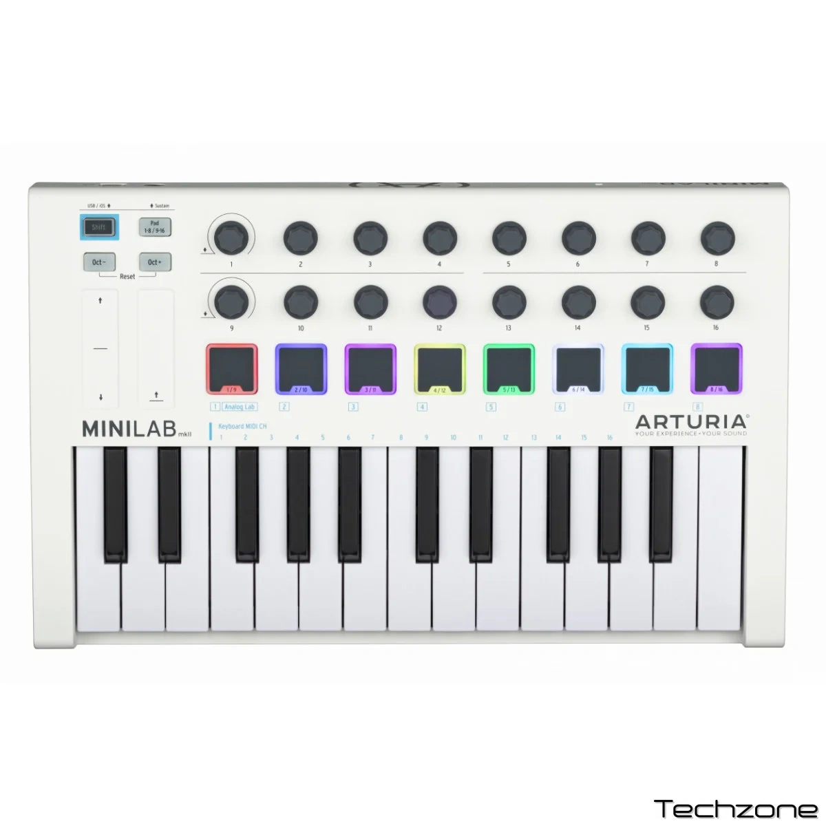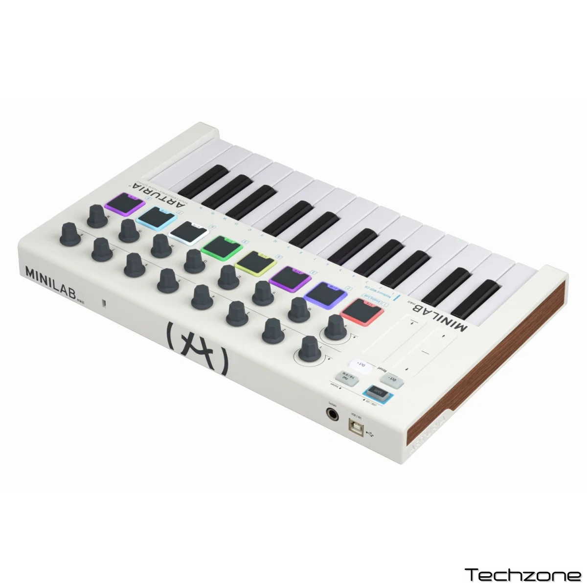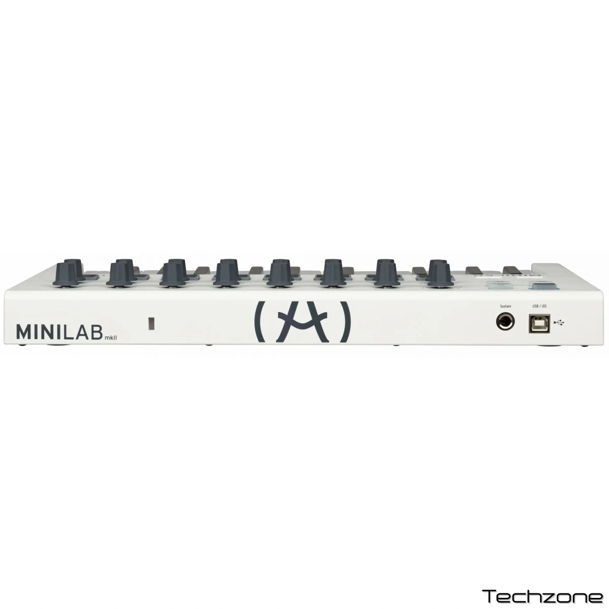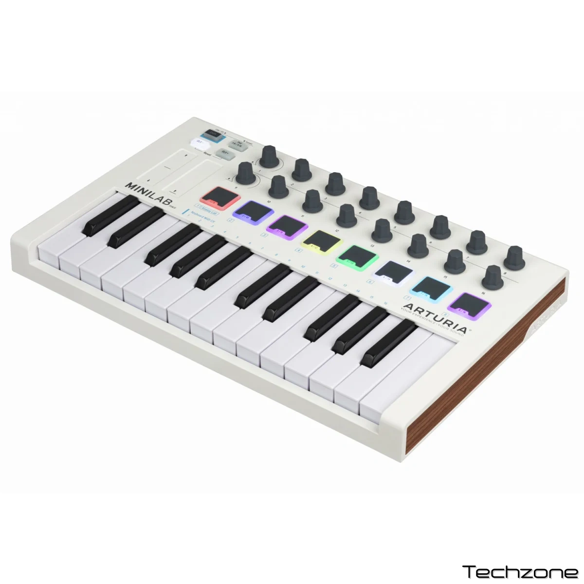 MiniLab MКII оснащен очень удобной клавиатурой на 25 тонких клавиш, 16 кнопками и 8 пэдами, а также сенсорными органами управления, благодаря чему способен успешно взаимодействовать с большинством виртуальных инструментов и ПО.