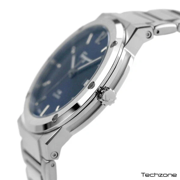 Корпус і браслет з нержавіючої сталі сріблястого кольору. Фіксований безель з нержавіючої сталі сріблястого кольору. Синій циферблат зі сріблястими стрілками та індексними арабськими цифрами для годинних міток. Тип циферблату: аналоговий. Індикація дати в положенні «3 години». Кварцовий механізм. Сапфірове скло, стійке до подряпин. Заводна головка з функцією натискання/відпускання. Суцільна задня кришка корпусу.