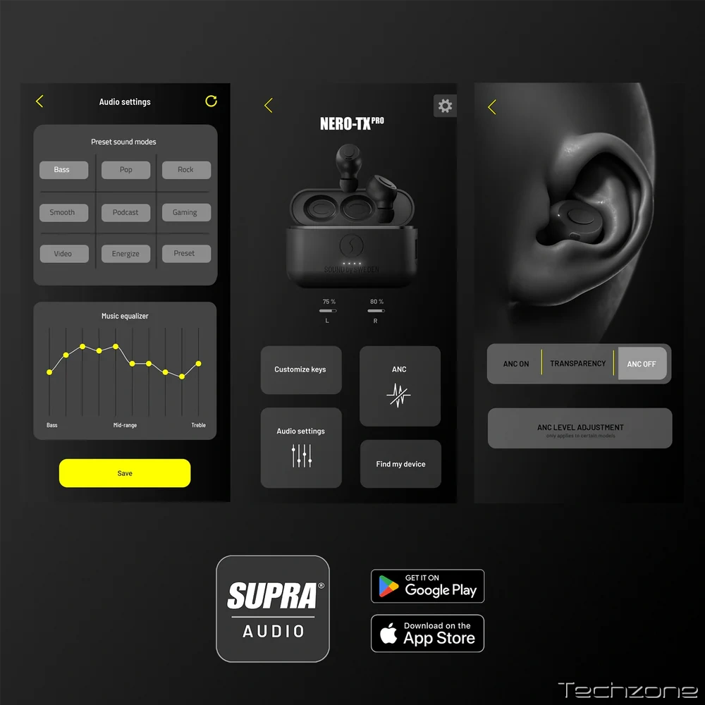 Кнопки на навушниках надають вам повний контроль над функціями телефону. Відтворення/пауза, відповідь/завершення дзвінків, регулювання гучності, активація шумозаглушення, запуск голосового помічника тощо. У застосунку SUPRA Audio© ви можете легко запрограмувати, які функції повинні виконувати кнопки. Наприклад, 1 клацання = збільшення гучності, 2 клацання = зміна пісні, 3 клацання = активація ANC тощо.