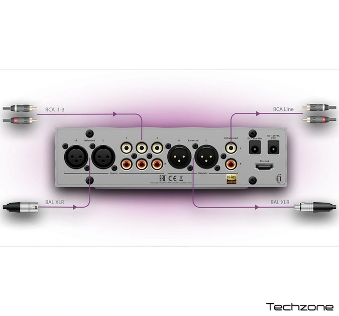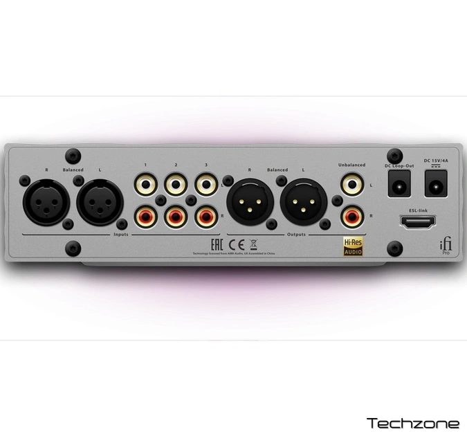 На задней панели остался выход, описанный как ESL-link, который должен использоваться для подключения электростатической насадки для наушников, анонсированной iFi Audio.