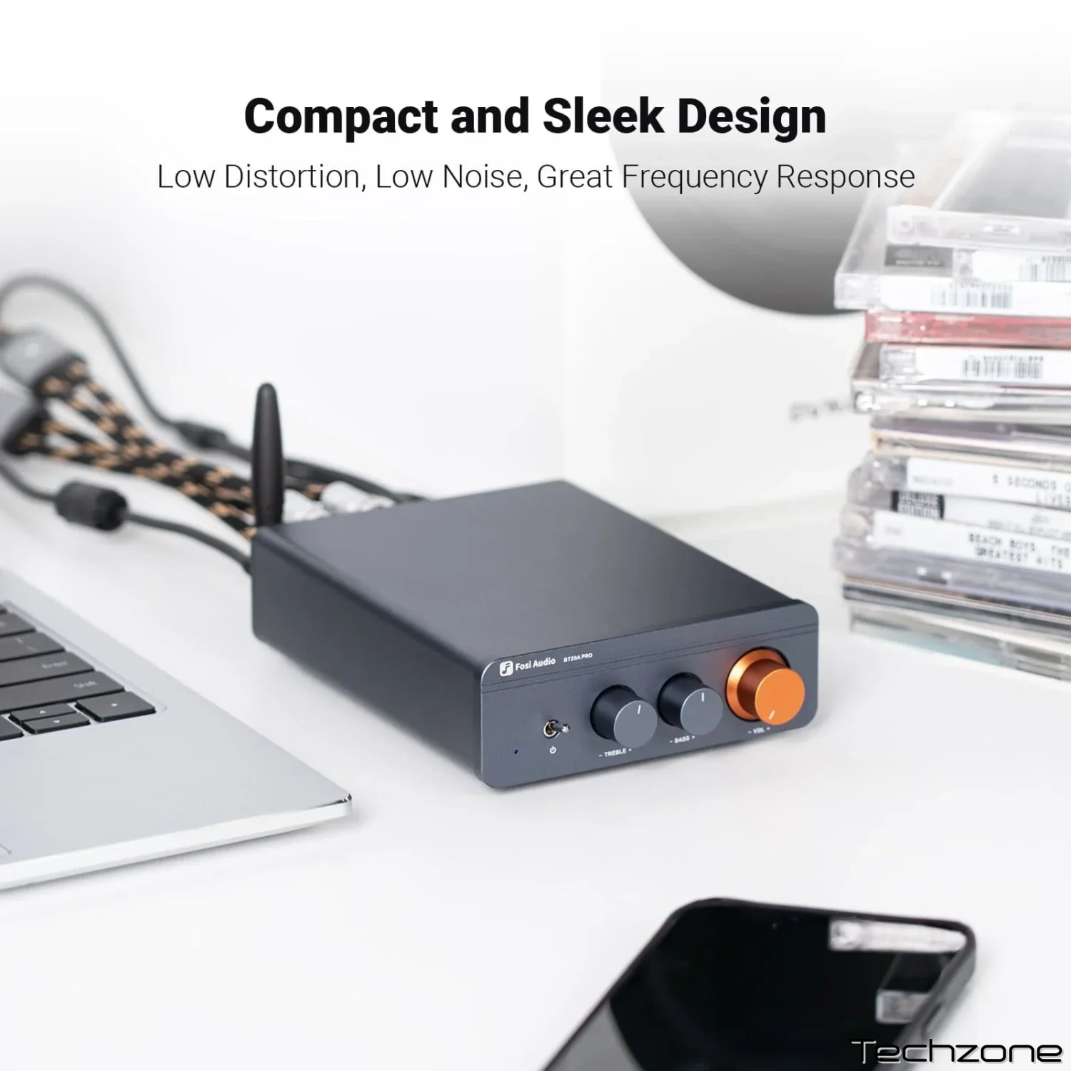 Fosi Audio BT20A PRO пропонує унікальний дизайн для управління звуком. В положенні на середині звучання залишається оригінальним, без доданих ефектів.