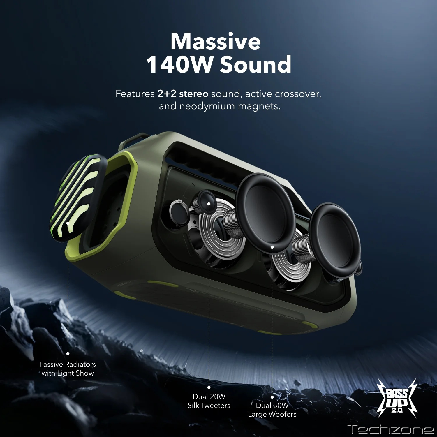 140 Вт максимальної потужності басів: відчуйте силу басів у кожній пісні завдяки подвійним вуферам, що забезпечують глибину та чіткість звучання. З BassUp™️ 2.0 вихідна потужність збільшується зі 100 Вт до приголомшливих 140 Вт — це на 160% більше ніж у BassUp першого покоління.