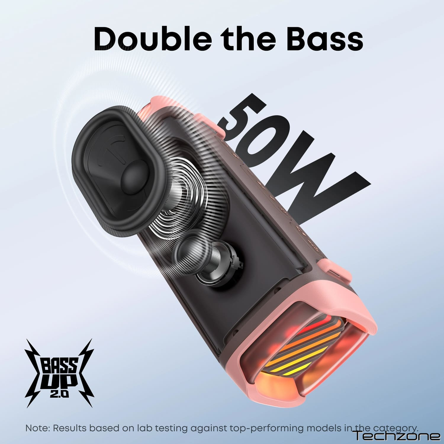 Подвійний бас із BassUp™ 2.0: потужний звук 50 Вт з басами глибиною до 56 Гц. BassUp™ 2.0 і технологія DSP забезпечують насичені низькі та чіткі високі частоти. Серйозна аудіопродуктивність у компактній портативній колонці.