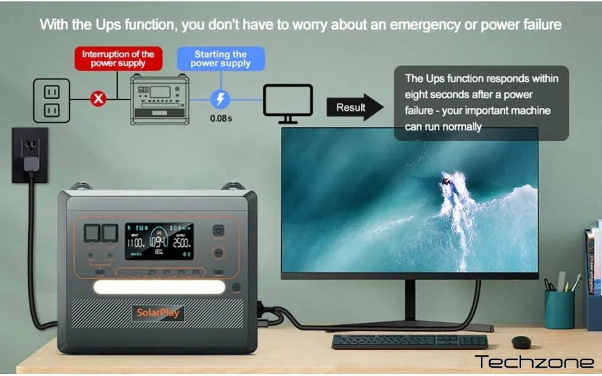 Этот портативный блок питания имеет ИБП, который обеспечивает основное питание устройств, подключенных к розетке переменного тока. В случае сбоя питания он переключается на аккумулятор Q2402M (Q2501) за 0,08 секунды. Это защищает от перебоев питания, вызванных стихийными бедствиями, и предоставляет время для восстановления работы или безопасного выключения.