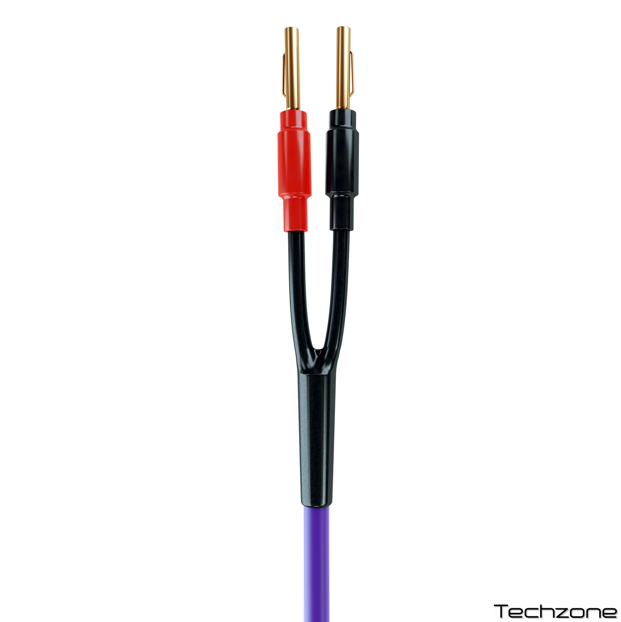 Провідники виготовлені з безкисневої міді (OFC) чистотою 99,99%, що гарантує стабільність параметрів і низький рівень втрат. Скручена геометрія жил зменшує вплив електромагнітних перешкод, а подвійна ізоляція з модифікованого ПВХ забезпечує захист та дозволяє приховану інсталяцію під штукатуркою чи бетоном. Кабель оснащений зручними позолоченими конекторами типу «банан».