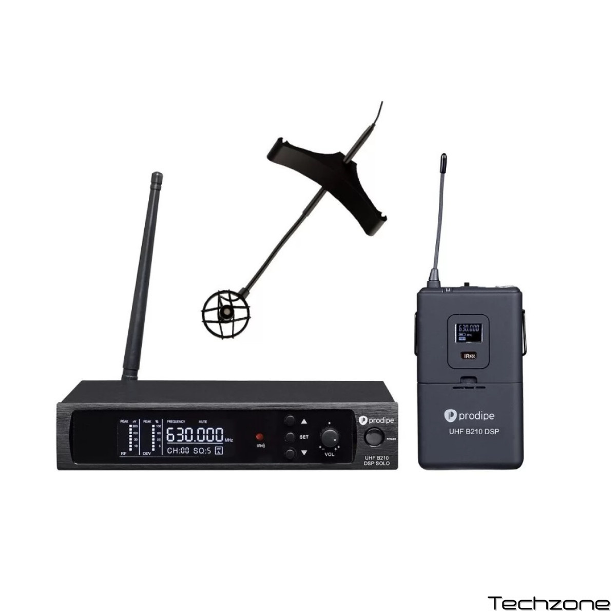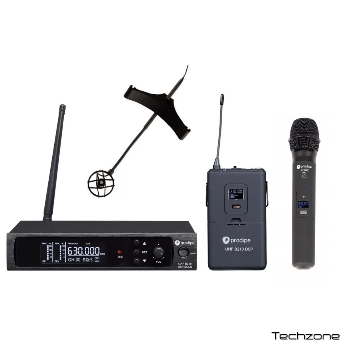 Также в комплект входит вокальный микрофон Prodipe UHF M850 MK2 с кардиоидной направленностью. Он оснащён динамической капсулой, имеет частотный диапазон 50 Гц – 16 кГц и чувствительность -71 дБ ±3 дБ. Микрофон работает от двух батареек типа AA и обеспечивает до 8 часов непрерывной работы. Его можно использовать для вокальных выступлений, репетиций и др.