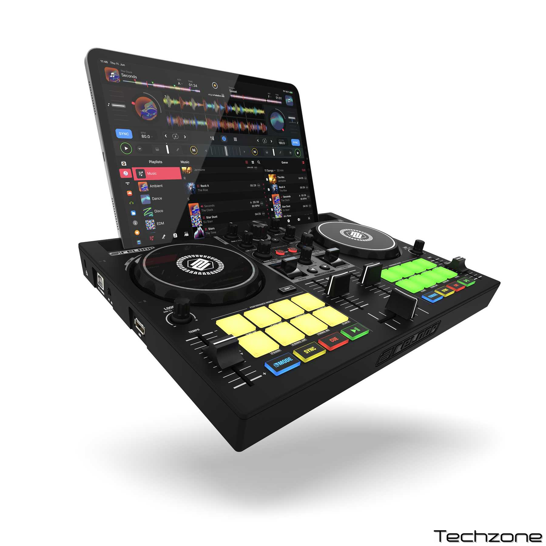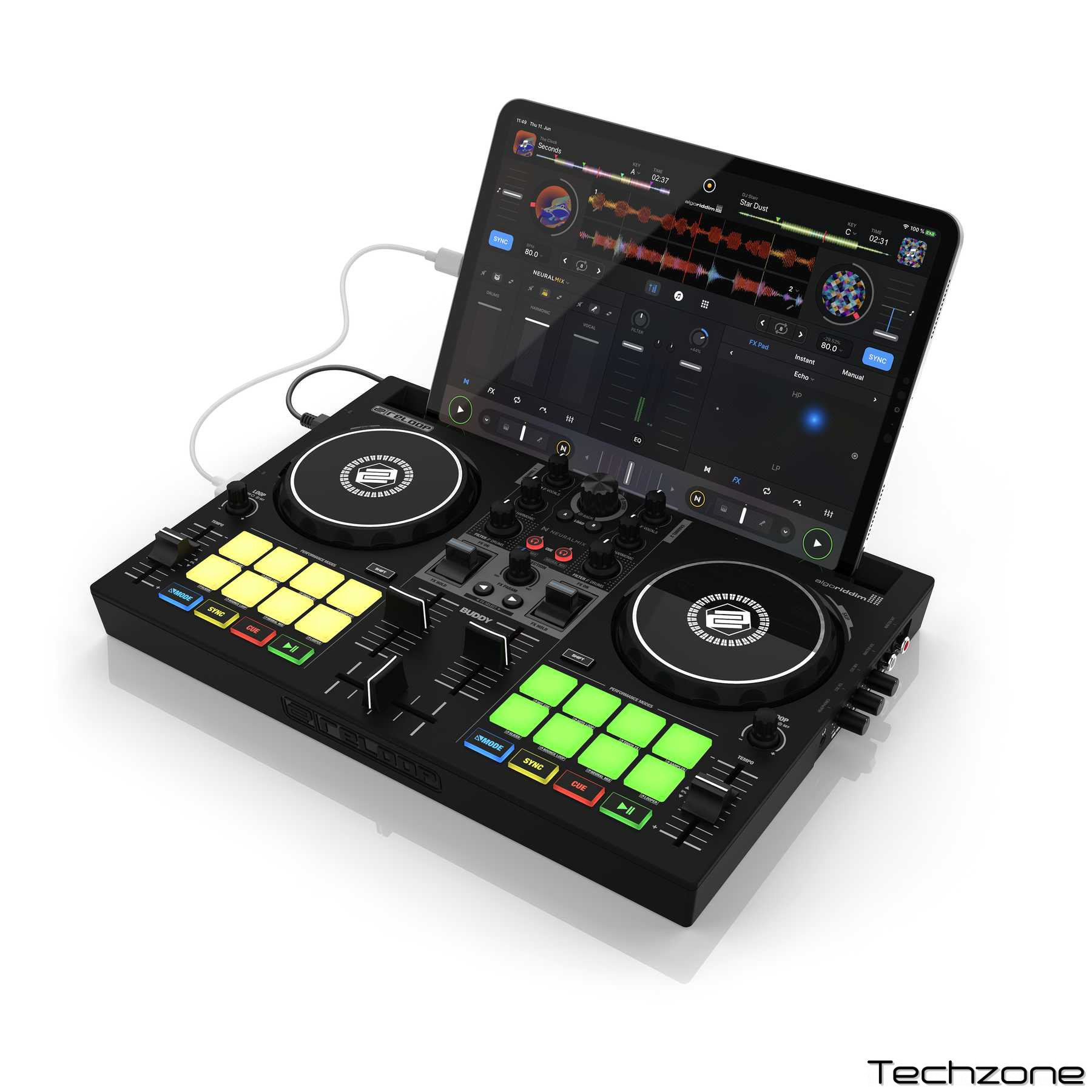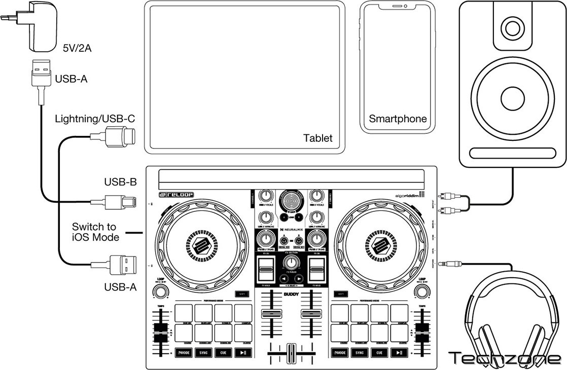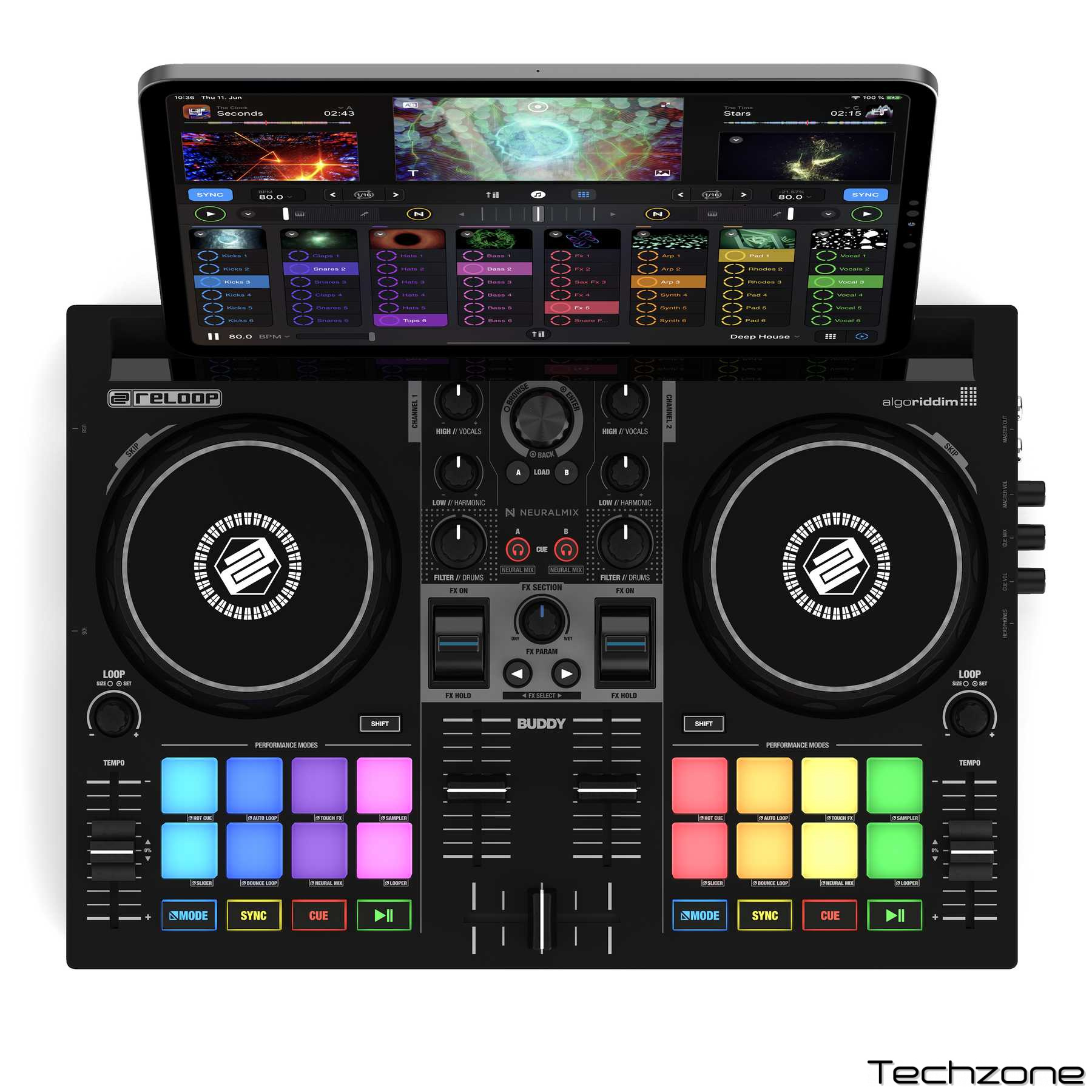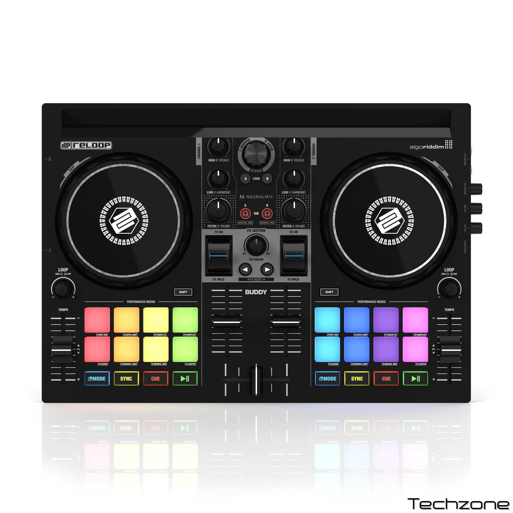 Компактний і потужний 2-канальний DJ-контролер який пропонує вам повний контроль над своїми міксами завдяки потужним функціям, включаючи інтуїтивно зрозумілий розділ пэдів, що складається з 8 режимів виконання (підказка швидкого доступу, автоматичний цикл, сенсорні ефекти, семплер, слайсер, Bounce loop, Neural Mix™, лупер), спеціальні елементи керування петлями, гнучка секція ефектів (утримування й перемикання) і чутливі джоги для точного міксингу та скретчингу. А завдяки спеціальній інтеграції з програмним забезпеченням djay від Algoriddim і вбудованому аудіоінтерфейсу USB, Reloop Buddy забезпечує миттєву сумісність зі смартфонами, планшетами та комп’ютерами, крім того його вбудований слот для пристрою може вмістити смартфони та планшети з діагоналлю до 12,9 дюйма, що зводить загальну площу пристрою до мінімуму. Роздільна здатність звукової карти: 24 біт/48 кГц. Частотна характеристика: 20 Гц-20 кГц. Співвідношення сигнал/шум: 95 дБ (USB). THD: <0,1%. Живлення: DC-5V > 2A USB-B. Master Out: RCA. Вихі