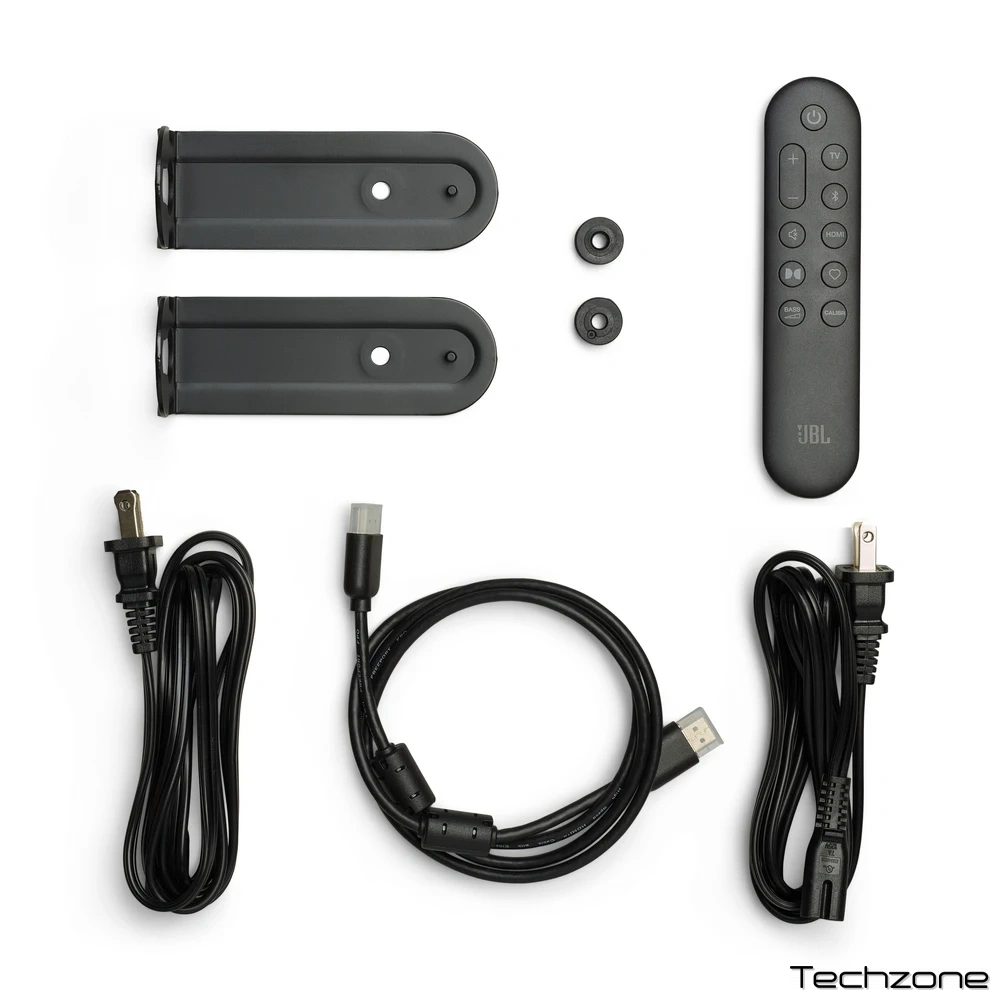 Комплектація: саундбар JBL BAR 300MK2, пульт дистанційного керування + 2 батарейки, кабелі живлення (до 4 залежно від регіону), HDMI кабель, монтажні кронштейни, інструкція, шаблон для настінного монтажу.