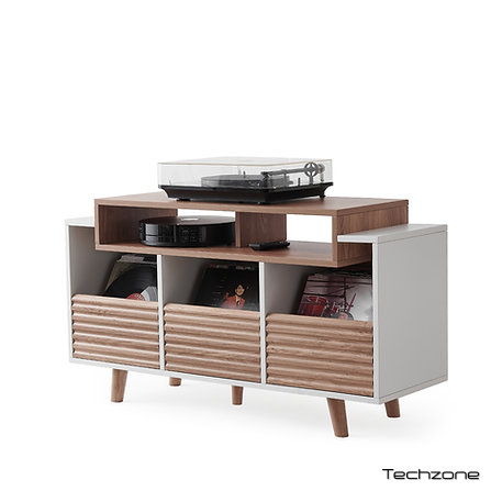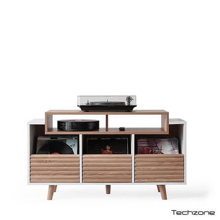 Доступна у двох варіантах оздоблення – чорний/горіх та білий/світлий дуб – вона бездоганно впишеться в будь-який інтер'єр, додаючи йому сучасного та елегантного вигляду. Ця модель має три шухляди, кожна з яких може вмістити до 80 вінілових платівок. Шухляди оснащені інноваційною системою захоплення, яка запобігає ковзанню платівок, забезпечуючи безпечну та зручну організацію.