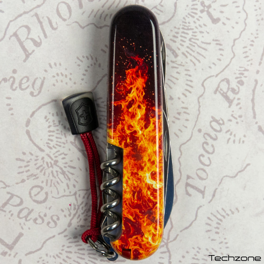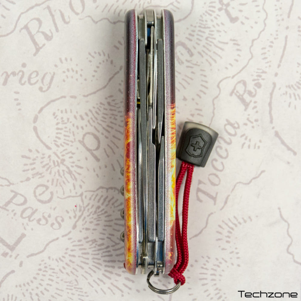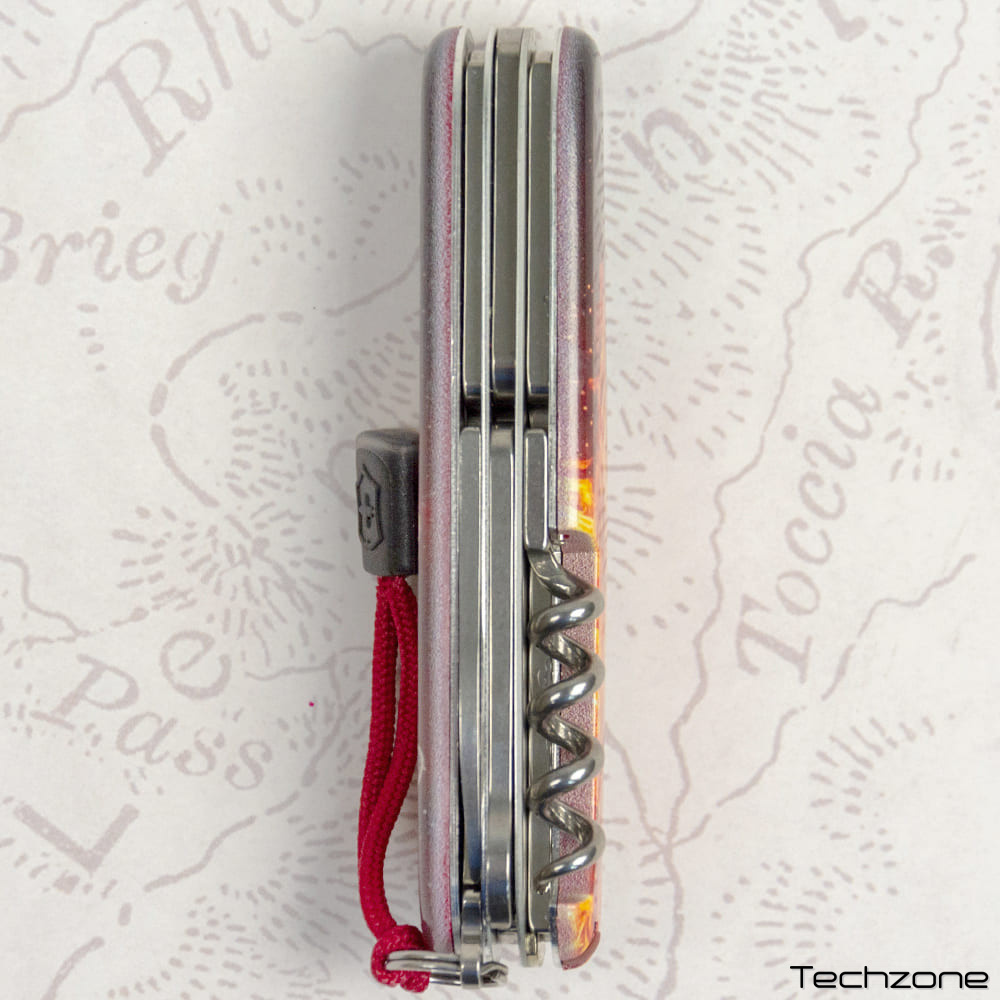 Кольцо для ключей, Пинцет, Зубочистка, Ножницы, Штопор, Малое лезвие, Булавка, Крючок многоцелевой, Большое лезвие, Шило - кернер, Открывалка для бутылок, Малая плоская отвертка, Консервный нож, Большая плоская отвертка, Паз для снятия изоляции