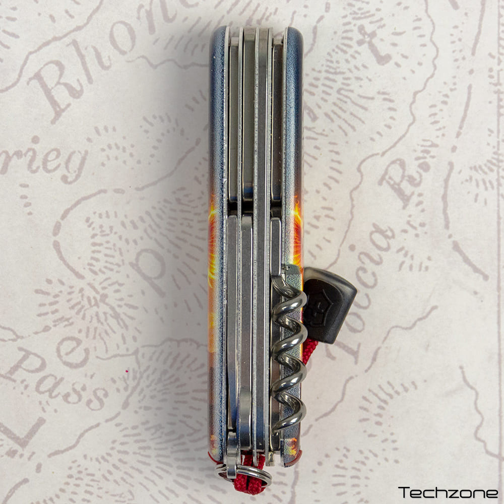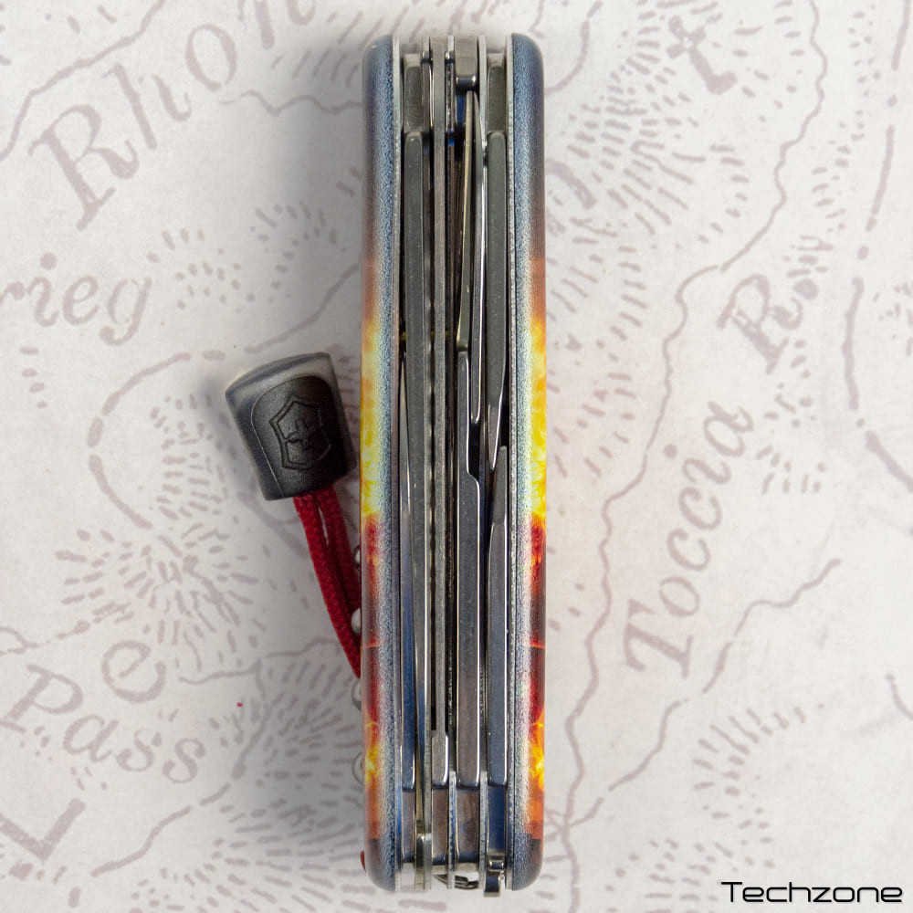 Кольцо для ключей, Пинцет, Зубочистка, Ножницы, Штопор, Малое лезвие, Булавка, Крючок многоцелевой, Пила по дереву, Большое лезвие, Шило - кернер, Открывалка для бутылок, Малая плоская отвертка, Консервный нож, Большая плоская отвертка, Паз для снятия изо