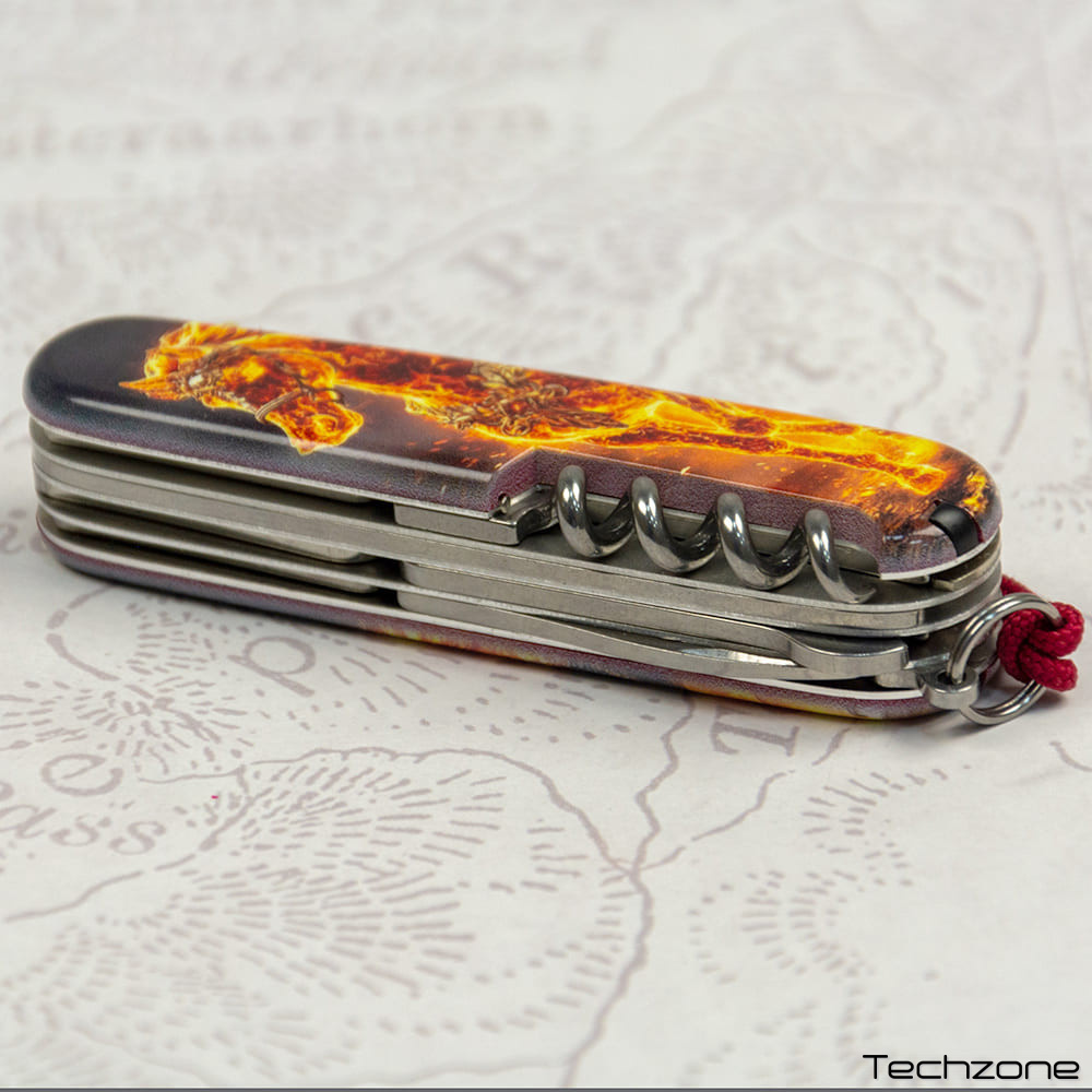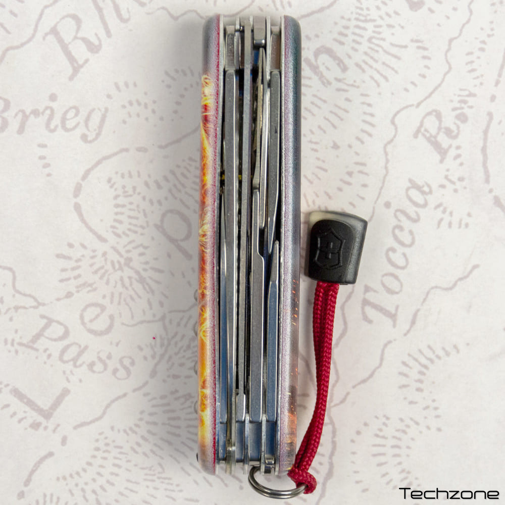 Кольцо для ключей, Пинцет, Зубочистка, Ножницы, Штопор, Малое лезвие, Булавка, Крючок многоцелевой, Пила по дереву, Большое лезвие, Шило - кернер, Открывалка для бутылок, Малая плоская отвертка, Консервный нож, Большая плоская отвертка, Паз для снятия изо