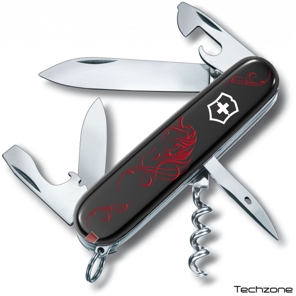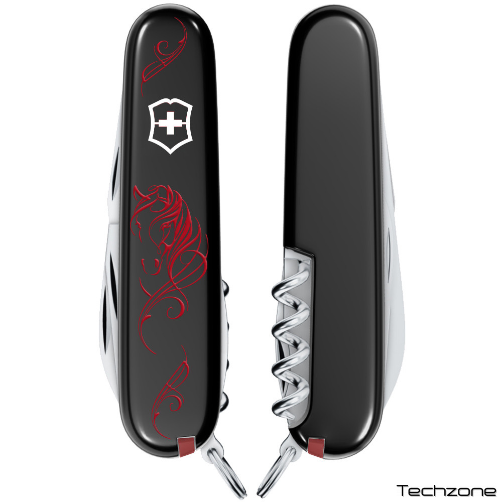 Складной нож SPARTAN ZODIAC 2026 [Красный конь] из эксклюзивного выпуска, посвященного году Лошади. Классический карманный нож Spartan 91 мм на 12 функций в сочетании с персонализированным праздничным дизайном с красной печатью Лошади на фоне черной глянцевой накладки.