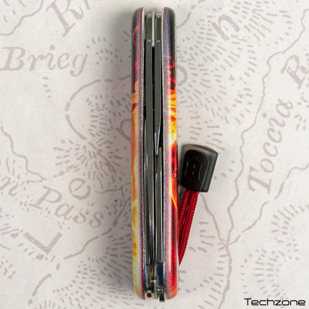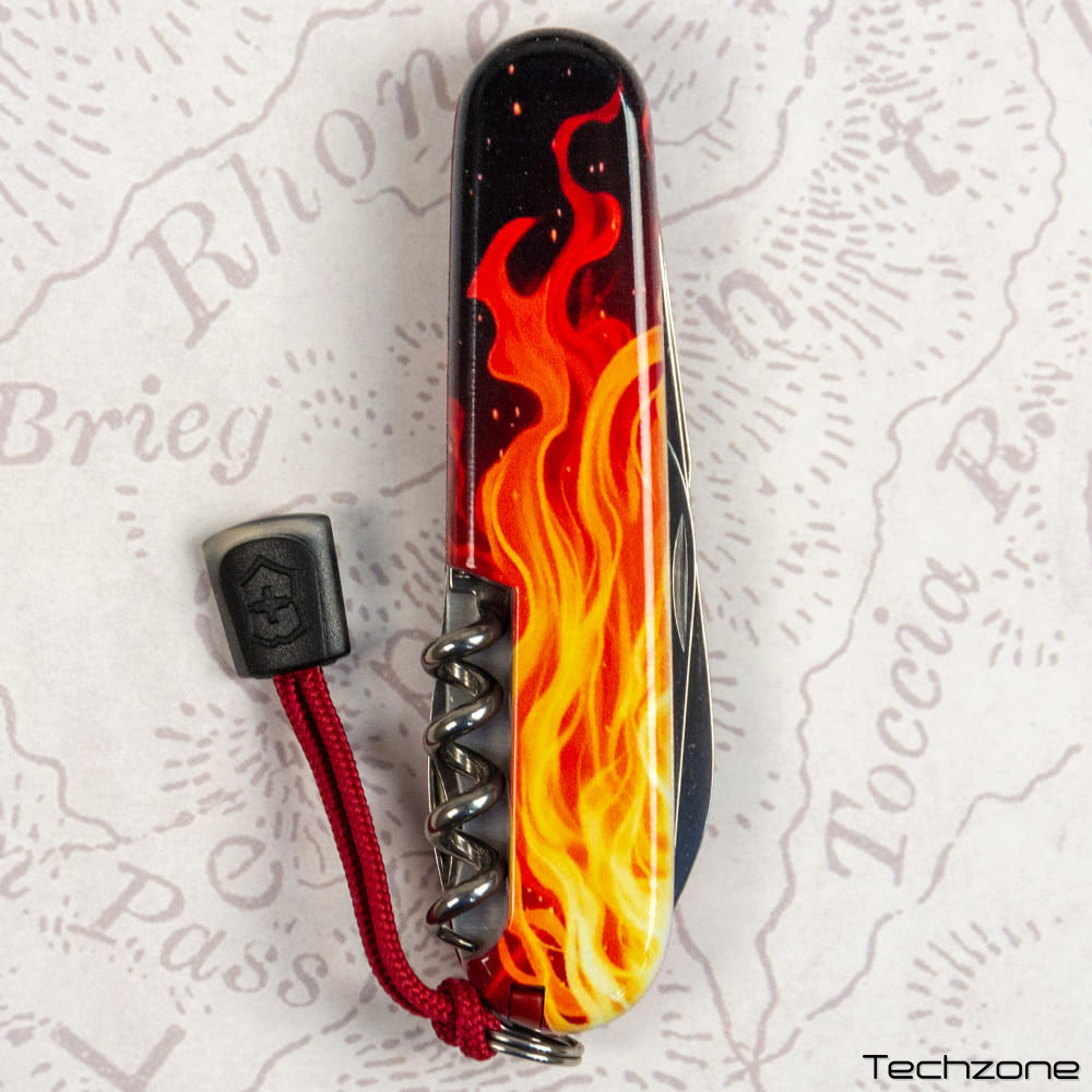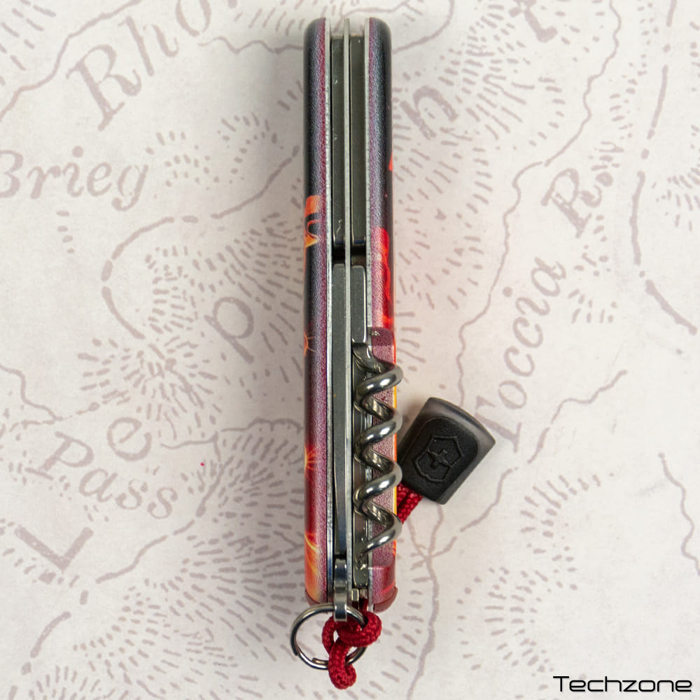 Кольцо для ключей, Пинцет, Зубочистка, Штопор, Малое лезвие, Булавка, Большое лезвие, Шило - кернер, Открывалка для бутылок, Малая плоская отвертка, Консервный нож, Большая плоская отвертка, Паз для снятия изоляции