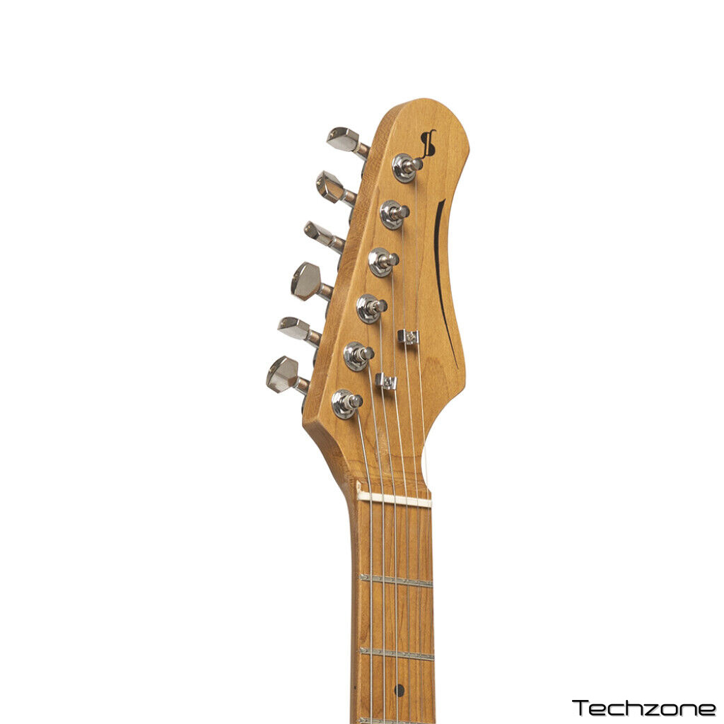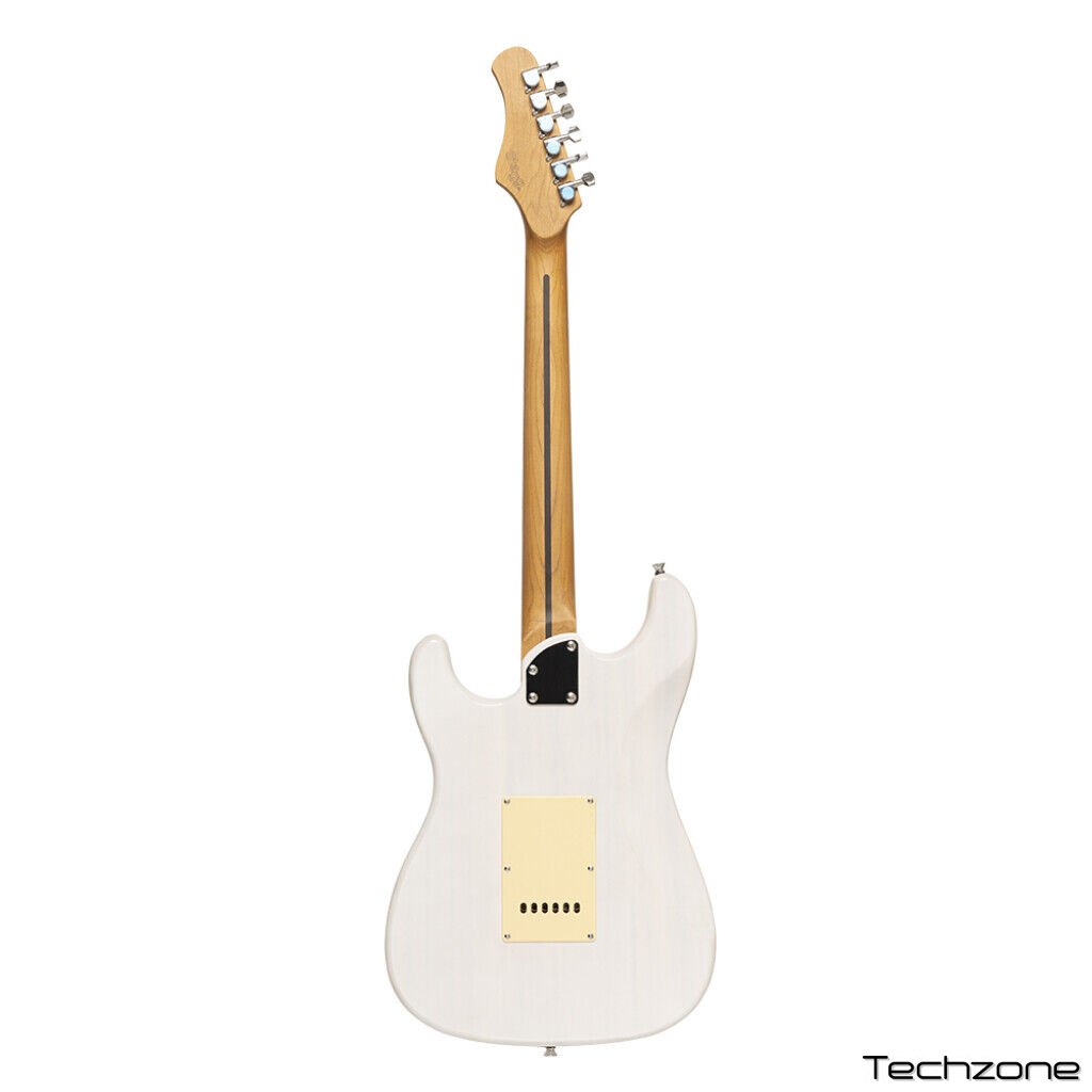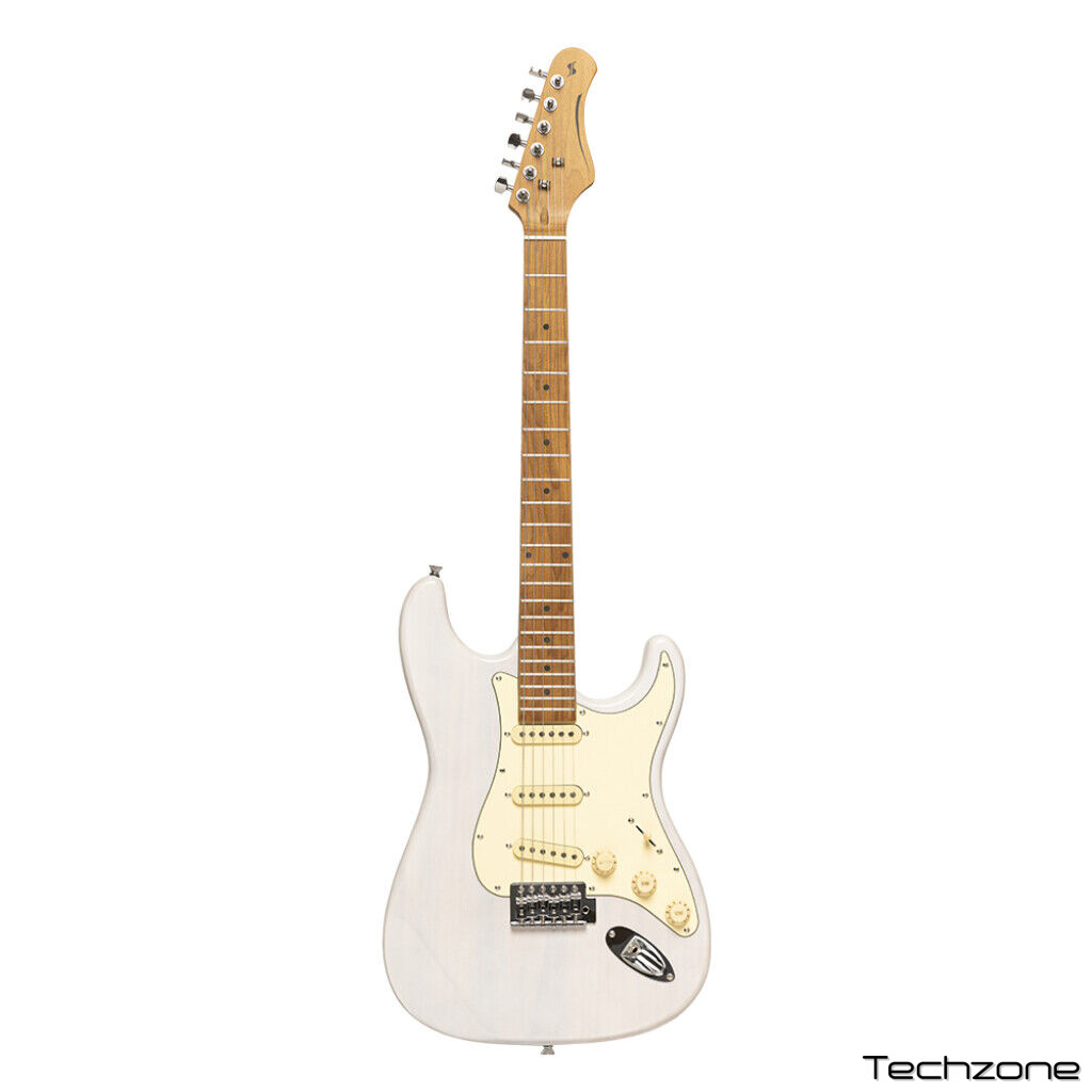 STAGG SES-55 – шестиструнная винтажная электрогитара серии «S» в корпусе типа «стратокастер» в классическом цвете. Корпус инструмента выполнен из массива павловнии. Гриф на болтовом креплении с легким доступом к последним ладам обладает матовой отделкой и сделан из клёна с кленовой накладкой. У гитары 22 лада, маркеры ладов выполнены в виде черных точек. Электрогитара STAGG SES-55 оснащена тремя звукоснимателями-синглами, одной ручкой регулировки громкости и двумя тембра. Для переключения звукоснимателей установлен 5-ти позиционный переключатель. Бридж вибрато выполнен в S-стиле, колки - никелевые, литые. Верхний порожек - костяной. На гитару установлены струны корейского производства и пикгард состаренного белого цвета. Мензура - 648 мм.