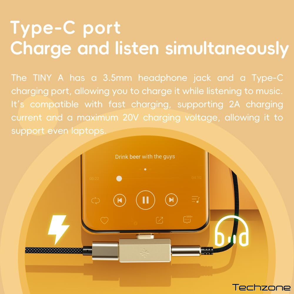 Tiny A оснащен 3,5 мм выходом для наушников + разъемом USB-C для зарядки/питания.