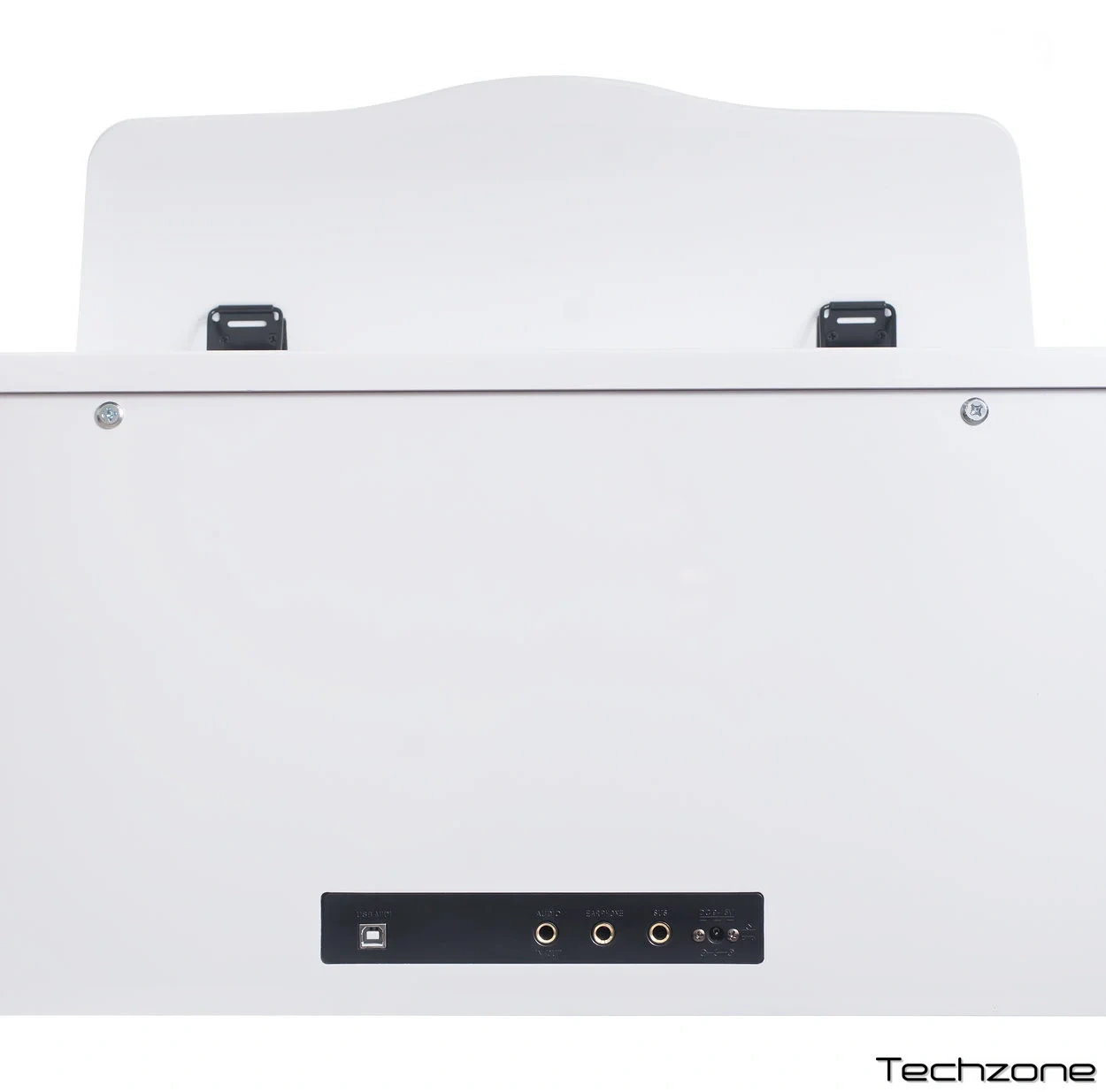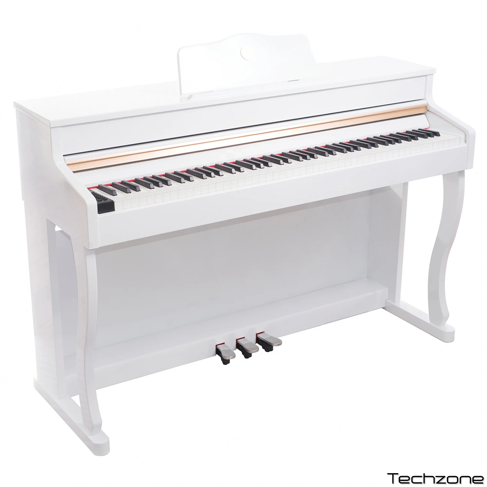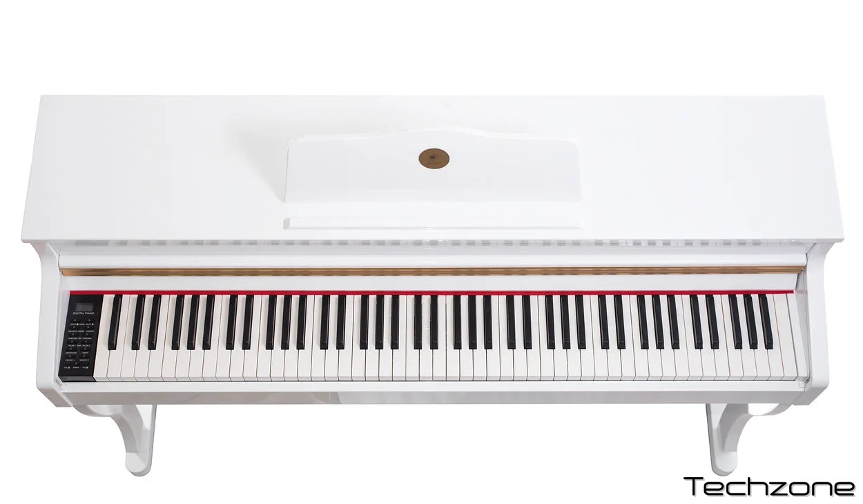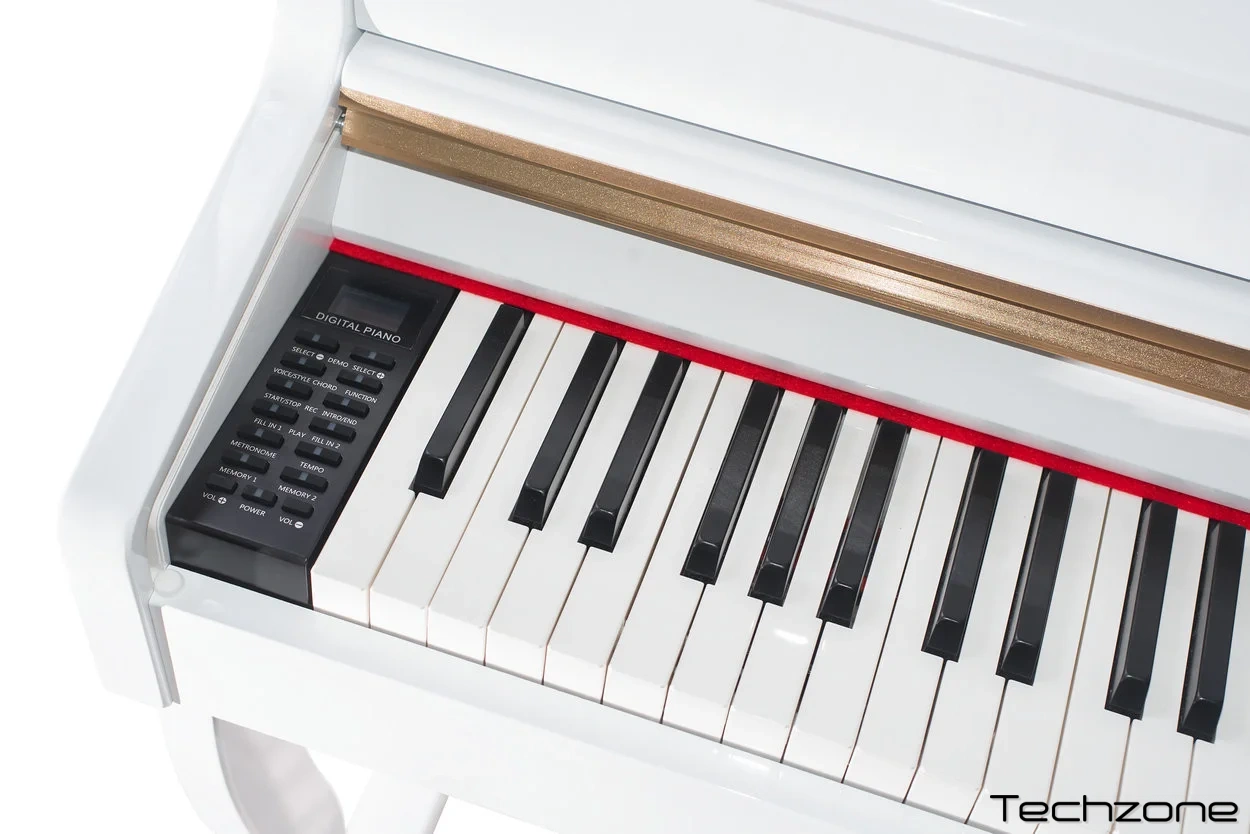 Alfabeto Maestro – 88-клавишное цифровое пианино с молоточковой механикой, функцией беспроводной связи Bluetooth и встроенным 25-ваттным динамиком. Maestro имеет активную клавиатуру, которая чувствительна к силе нажатия (16 уровней). Чем сильнее будет нажата клавиша, тем сильнее выйдет звук. Вес клавиатуры тяжелее на низких нотах и легче на высоких, поэтому воспроизведение меняется постепенно в зависимости от диапазона звука, давая Вам ощущения от игры, как на обычном пианино. Новейшая технология чипа France Dream5 Series (5704) обеспечивает высокое качество звука по самой низкой цене, давая возможность получить превосходный опыт от игры. В комплект входит: стойка, блок питания, гарантийный талон, сертификат качества, руководство пользователя и блок педалей (сустейн, состенуто, софт), который подключается через соответствующий разъем. Так же есть разъемы USB, MIDI, аудио и для подключения наушников. Для удобства управления в данной модели предусмотрен LED дисплей. Также имеется место для размещения нотных тетрадей. Пианино выполнено в белом цвете.