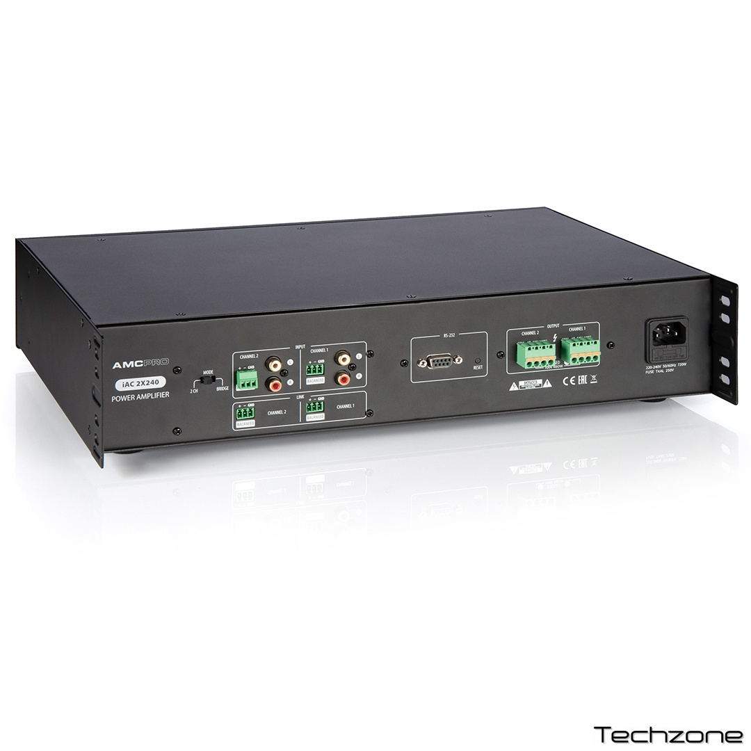 Двухканальный усилитель класса D с выходной мощностью 2X240 Вт. Предназначен для высококачественных музыкальных фоновых систем с напряжением 100 В и низким сопротивлением. Кроме того, его можно соединить мостом даже в режиме 100 В и использовать в качестве одноканального усилителя 480 Вт для аудиосистем 100 В. Содержит сбалансированный вход Phoenix & Stereo RCA и выход аудиосвязи. Усилители имеют порт управления RS232 для интеграции усилителей с системами автоматизации сторонних производителей, что позволяет использовать усилители iAC в больших и сложных аудиосистемах, которые можно автоматизировать и управлять дистанционно. Благодаря встроенному сигнальному процессору, уровень громкости усилителей, контроль тембра, отключение звука и режим ожидания можно контролировать с помощью поворотного селектора, а также с помощью протокола RS232.