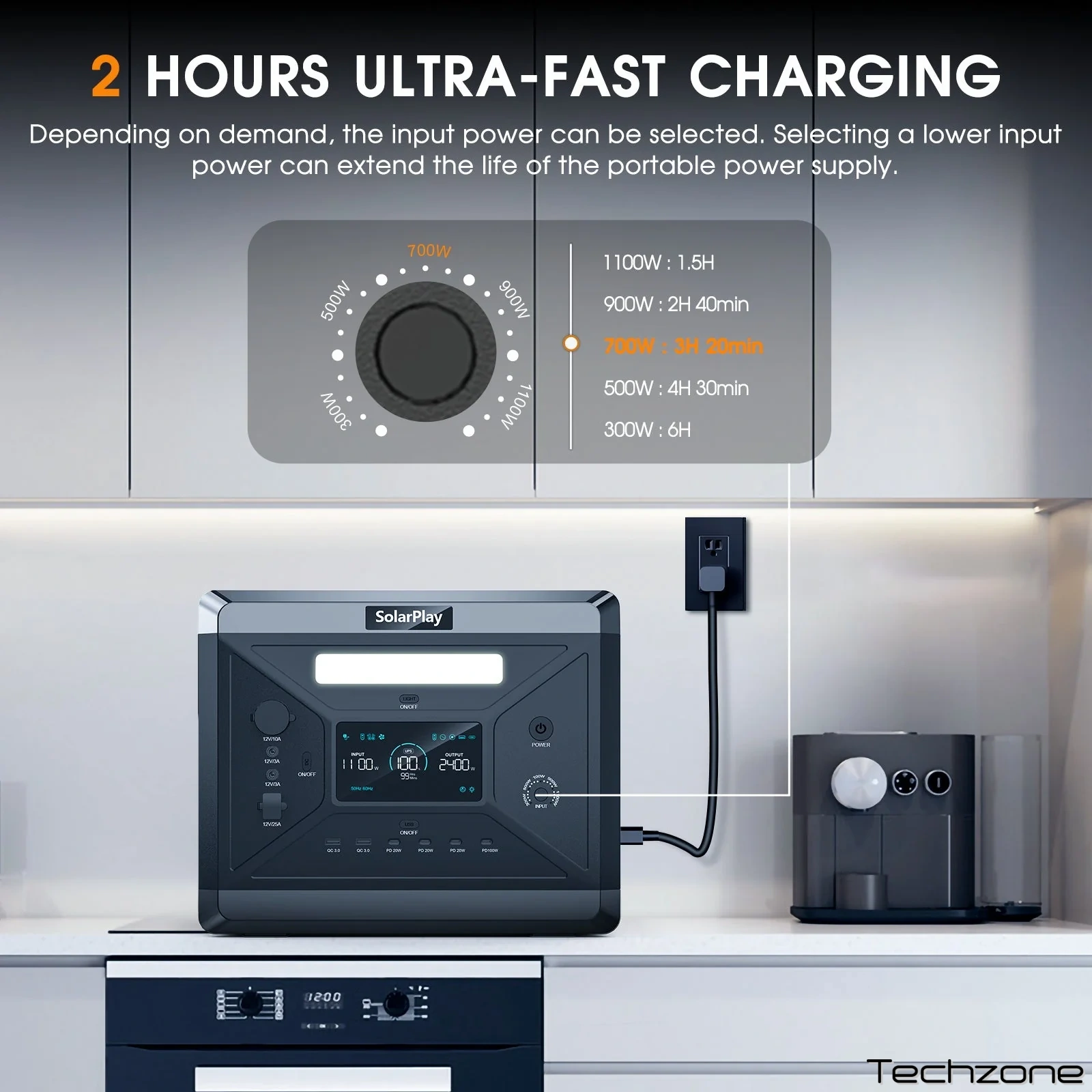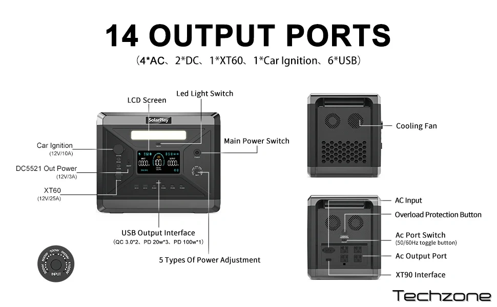 Він може регулювати вхідну потужність на п'яти рівнях: 300 Вт, 500 Вт, 700 Вт, 900 Вт та 1100 Вт, і може заряджатися відповідно до умов використання та потреб заряджання. Ви можете використовувати його безпечніше, а також продовжити термін служби вашого портативного джерела живлення, якщо оберете низьке вхідне живлення.