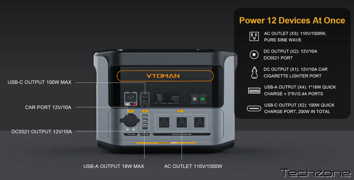 Одночасна зарядка до 12 пристроїв: Завдяки 12 вихідним портам, включаючи 3 розетки змінного струму, 4 USB-A, 2 USB-C, 2 DC5521 та 1 автомобільний порт, ви можете заряджати кілька пристроїв одночасно. Підтримує наскрізне заряджання для одночасного використання пристроїв.
