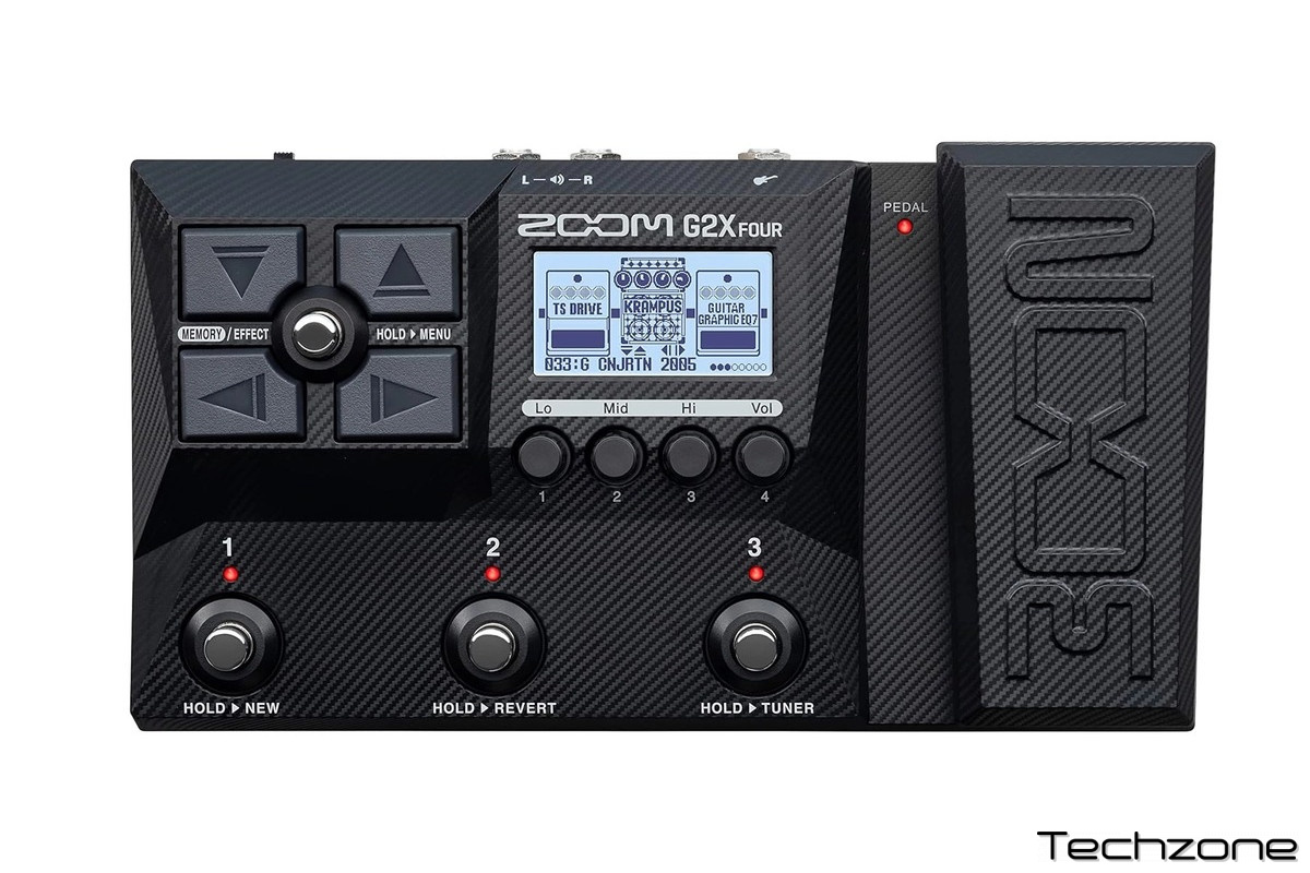 Zoom G2X Four має 22 підсилювачі та кабінети, що включають найпопулярніші моделі, наприклад, Fender Twin і Marshall JTM-45. Серед них можна підібрати підсилювач для будь-якого стилю музики. Кабінети використовують технологію Impulse Response та відрізняються 3-шаровою структурою з імпульсами, записаними з різною гучністю, що формує максимально достовірне та чутливе до динаміки звучання. Процесор пропонує 79 ефектів, серед яких є всі основні педалі ефектів. Більшість підсилювачів та ефектів мають реально існуючі прототипи. Одночасно можна включати до 7 ефектів у межах одного патчу.