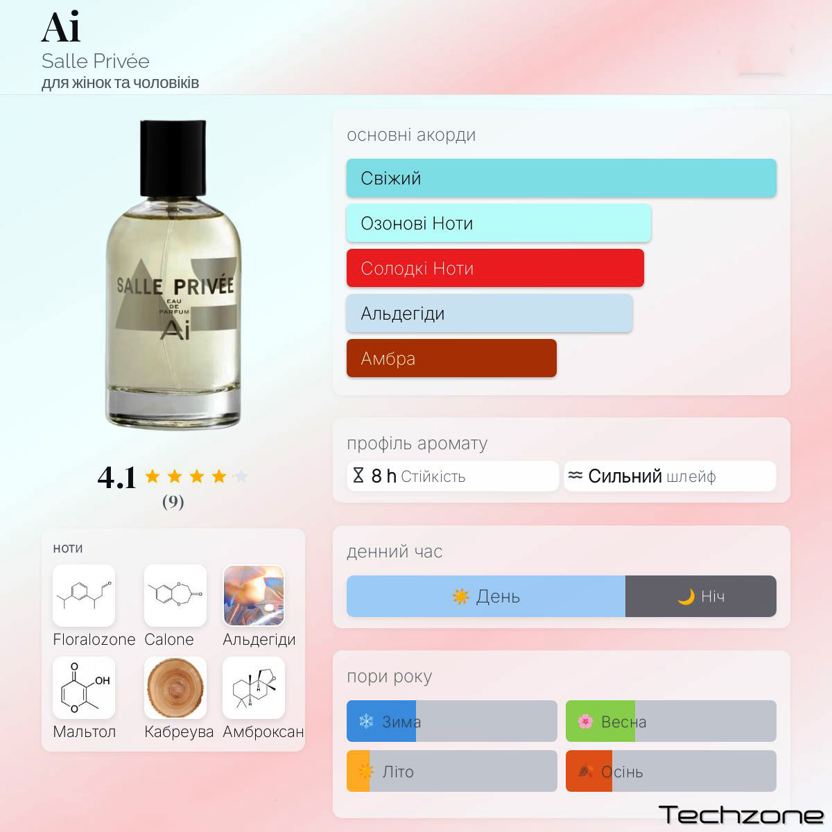 Парфуми Ai – це погляд у майбутнє парфумерії, де людина та машина об'єднують зусилля. Сонячний та солоний вітер амброксану CX, саліцилатів та велтолу, посилений оліями кипариса та чебрецю, призвели до створення справді революційних та захопливих парфумів. Ai втілює дух сучасної вишуканості SALLE PRIVÉE, використовуючи силу технологій та мистецтва для створення аромату, який переосмислює наше уявлення про парфуми.