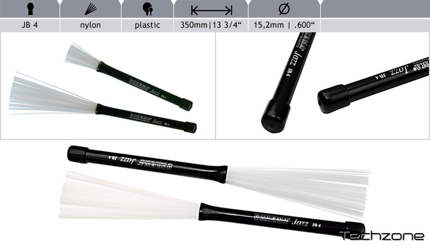 Джазові щітки Rohema JB 4 видають насичені та глибокі звуки. Щетина виготовлена з міцного нейлону, синтетичного матеріалу, який ми закуповуємо у європейських виробників. Тонкі нейлонові стрижні мають дуже гладку поверхню. Завдяки цьому JB 4 звучить трохи об'ємніше, ніж інші щітки з тонкими металевими дротами. Нейлонову щетину можна втягнути в ручку, тому вона добре захищена всередині.