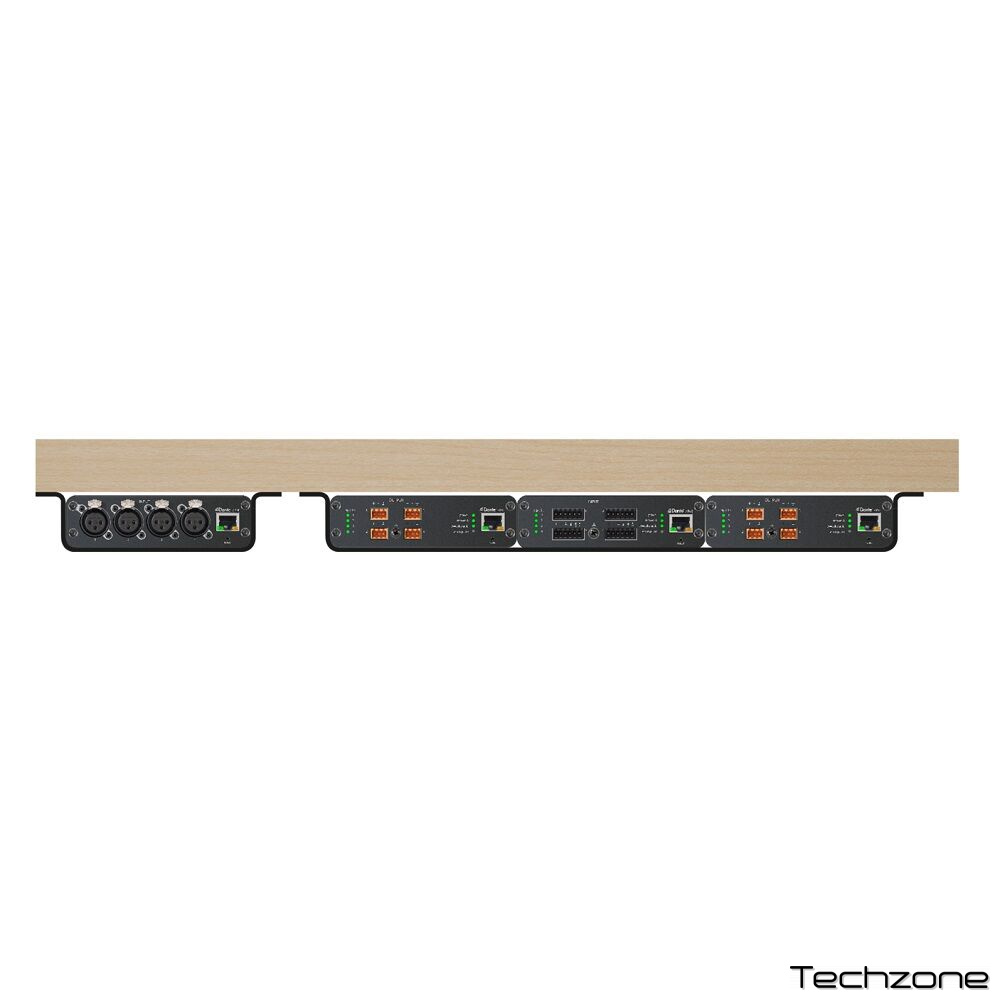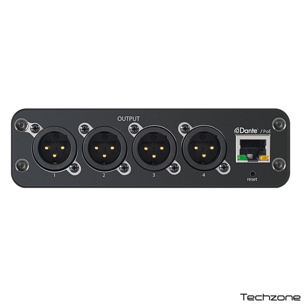Перетворює цифровий аудіосигнал Dante™ у чотири дискретні лінійні/мікрофонні аналогові сигнали для простої маршрутизації звуку та зручного дистанційного керування через браузер. Один порт Ethernet передає звук Dante та живлення (PoE – клас 0) Світлодіоди відображають стан пристрою та звуковий сигнал. Рядки управління для контролерів передустановок сторонніх виробників, включаючи Crestron® та AMX®. 4-смуговий C/S PEQ на кожному каналі Забезпечує підсумовування каналів для об'єднання сигналів Dante™ з мережі та надсилання їх через один аналоговий вихід. Програмне керування через браузер усіма параметрами пристрою для кожного вихідного каналу: Керування вимкненням звуку Цифрове посилення Контроль полярності Ширина стійки 1/3 Гвинт заземлення корпусу (тільки версія BLOCK) забезпечує загальне заземлення шасі для кількох входів. Доступні блокові роз'єми та стандартні варіанти XLR.