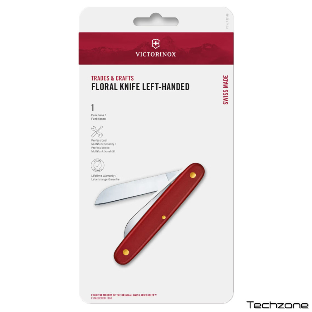 Ліворучний складаний ніж FLORAL для професійних квітникарів та садівників-аматорів. Фірмовий червоний дизайн із золотистими заклепками та логотипом компанії Victorinox. Чудовий кишеньковий інструмент, оснащений гострим лезом завдовжки 55 мм та поліамідним руків'ям 100 мм. Він легко зріже найжорсткіші гілки, стебла і листя. Для створення ідеальних квіткових композицій та догляду за рослинами.