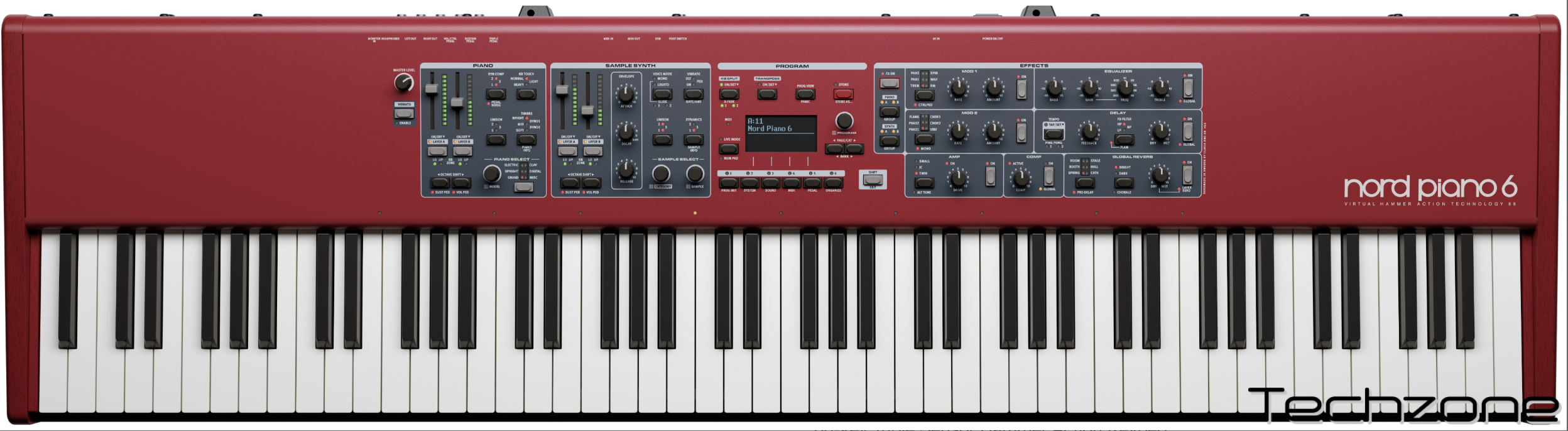 Nord Piano 6 88 оснащений широким набором вбудованих ефектів, які можна застосовувати як до окремих шарів, так і глобально. Для створення виразних звукових відтінків доступні модуляційні ефекти, серед яких Tremolo, Pan, Wah, Phaser, Flanger, Chorus та Ring Modulator.