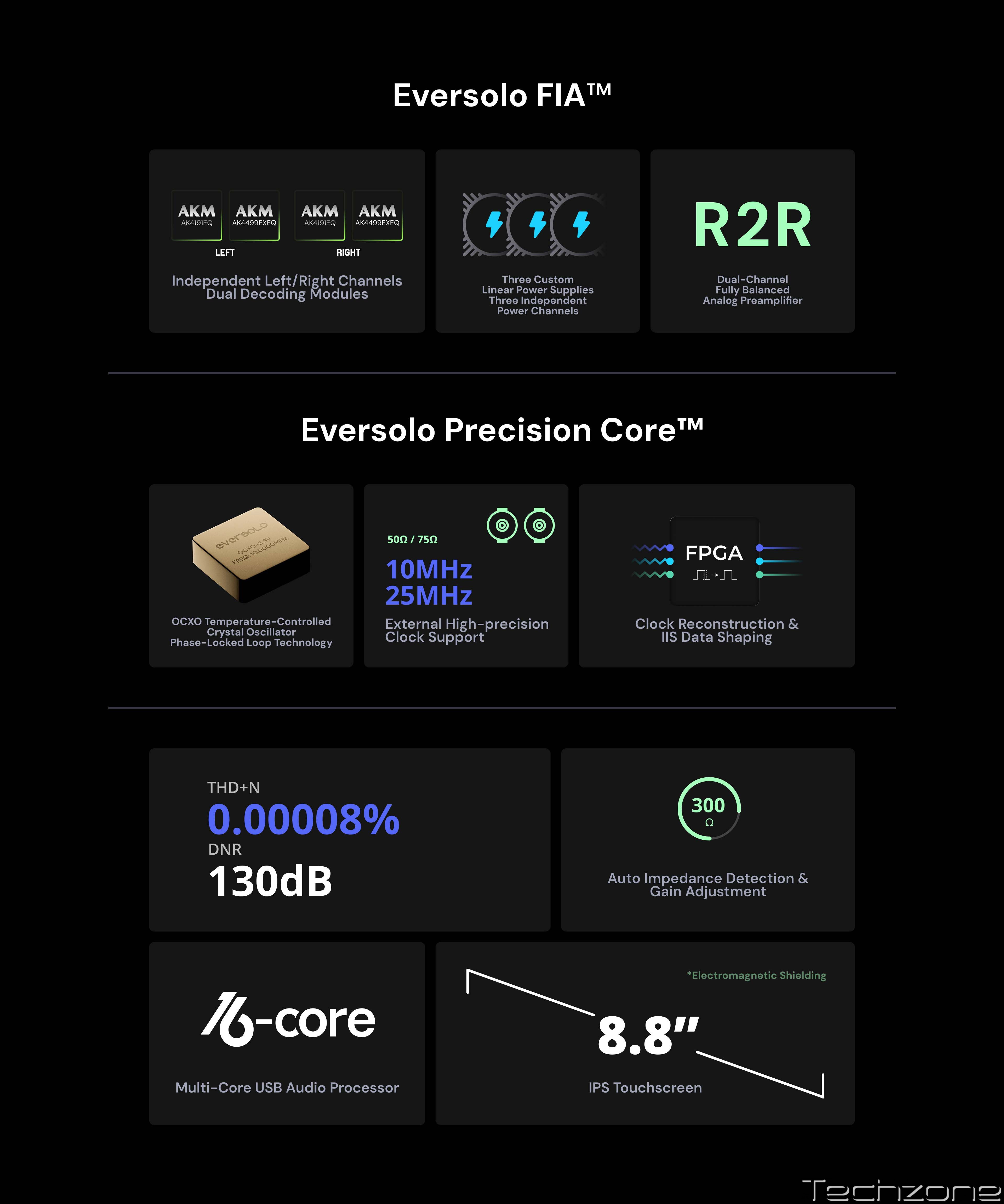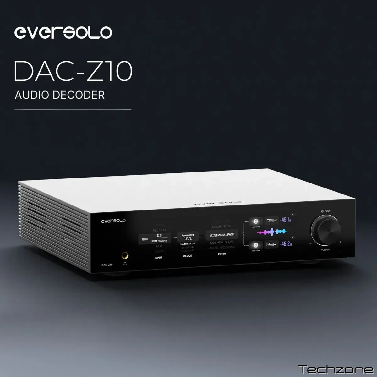 DAC-Z10 побудований на повністю ізольованій архітектурі (FIA) від Eversolo, яка повністю розділяє цифровий та аналоговий домени, щоб мінімізувати перешкоди та зберегти чистоту сигналу. Три незалежні лінійні джерела живлення окремо живлять лівий канал, систему та правий канал, дозволяючи кожному з них працювати в середовищі з наднизьким рівнем шуму. Його архітектура декодування включає два набори ЦАП AK4191 + AK4499 для незалежних лівого та правого каналів, поєднаних з повністю збалансованим аналоговим передпідсилювачем, який використовує точне двоканальне регулювання гучності R2R. Така конфігурація досягає чудового DNR та нижчого THD+N, розкриваючи весь потенціал музики.