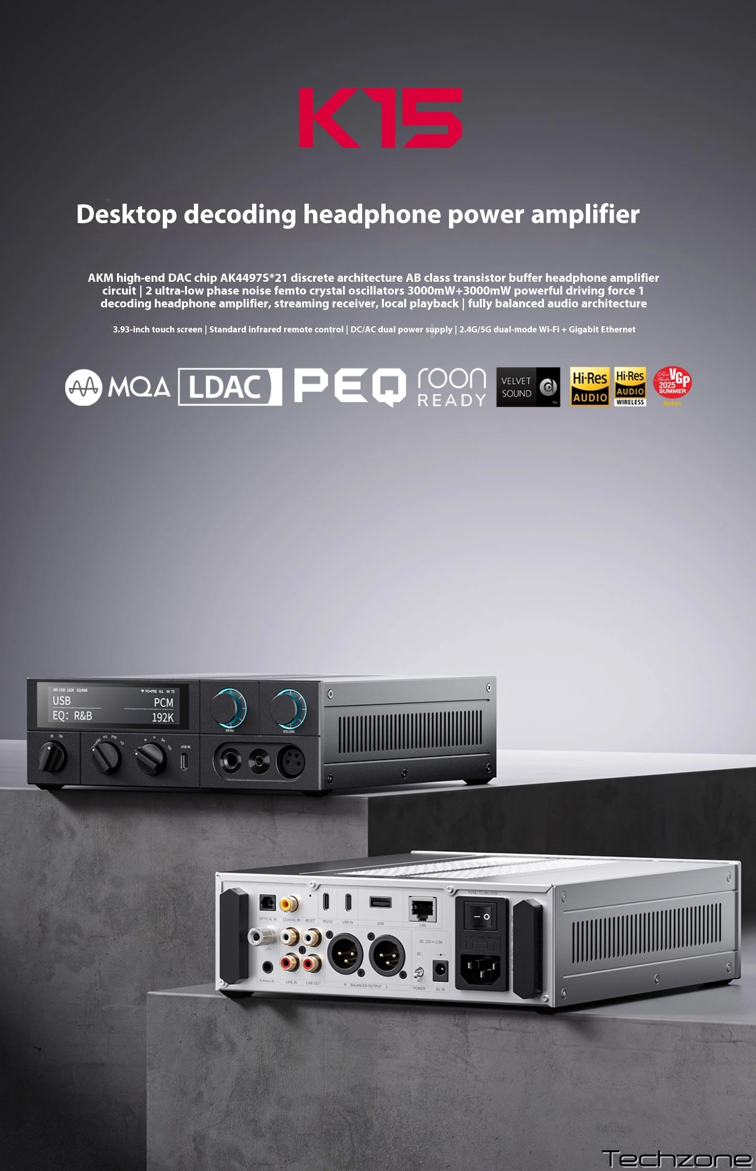Вихідна потужність вражає: у режимі надвисокого посилення K15 забезпечує до 3000 мВт + 3000 мВт (32 Ом балансний) та 1400 мВт + 1400 мВт (32 Ом нескладний) , що дозволяє легко підключати вимогливі навушники.