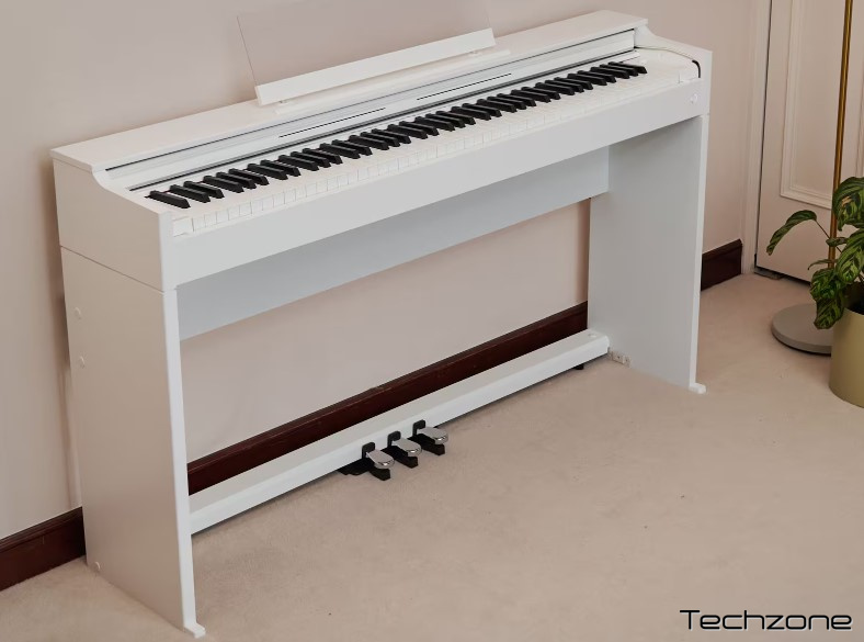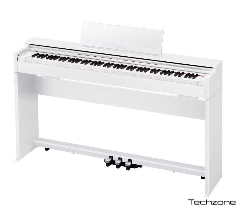- Клавіатура із текстурою слонової кістки та чорного дерева дарує комфорт навіть під час тривалих репетицій.