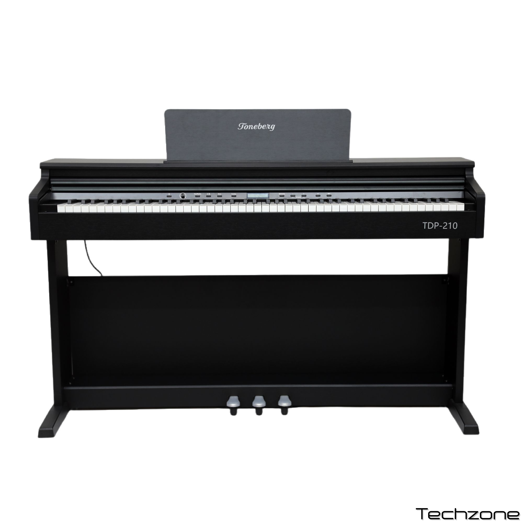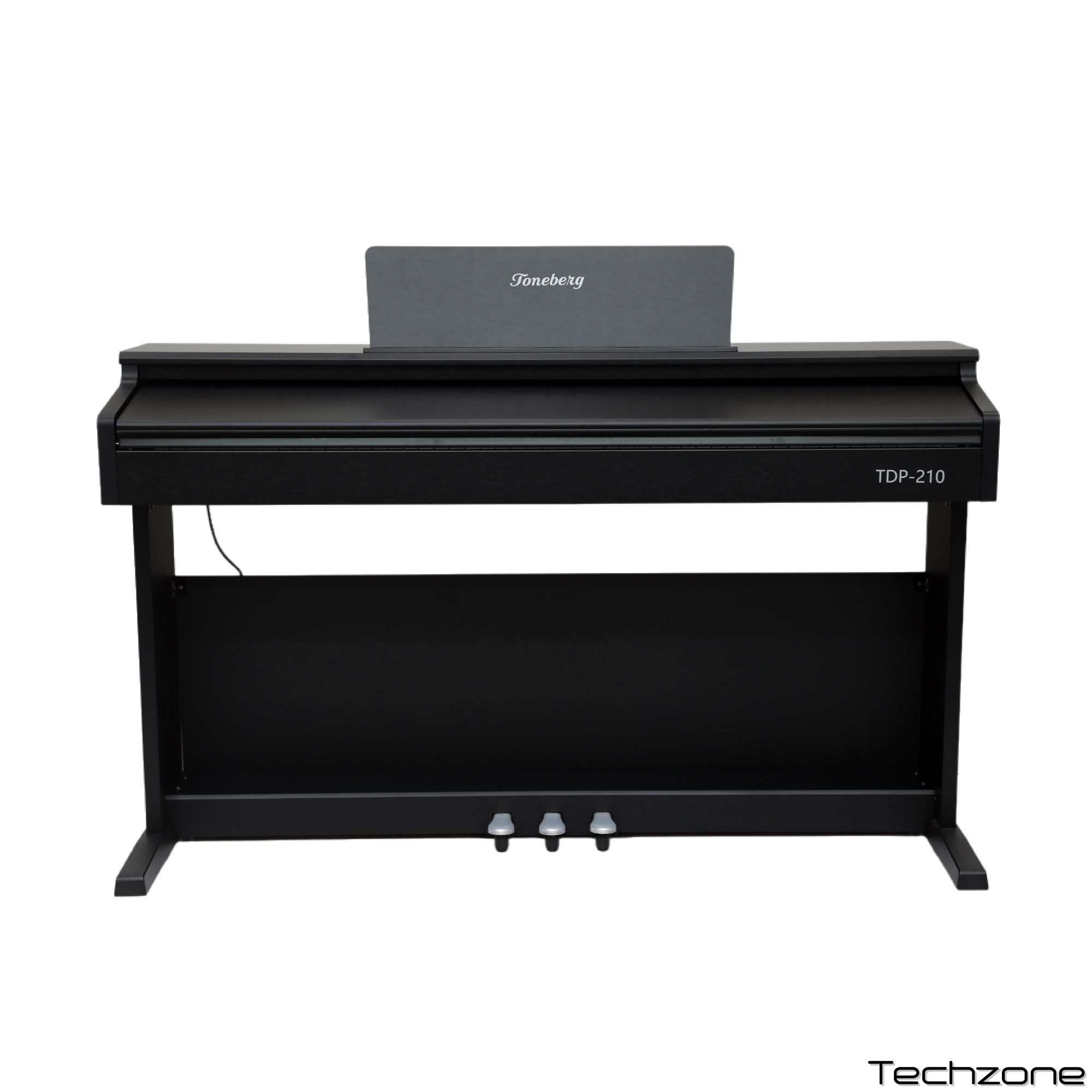 Технічні характеристики: Модель: Toneberg TDP-210 Клавіатура: 88 клавіш, молоточкова Звуковий модуль: France Dream 5716 Семплювання: Steinway digital stereo sampling Екран: багатофункціональний LED з підсвіткою Поліфонія: 128 голосів Тембри: 238 Ритми: 200 Демо-пісні: 100 MP3-плеєр: вбудований з незалежним керуванням Функції: вибір і комбінація тембрів, ритмів, демо, метроном, акорди, запис, транспонування, синхронізація, вставка, прелюдія та кода, подвійний тембр, подвійна клавіатура, хор, динаміка Інтерфейси: аудіовихід/вхід, USB-MIDI, USB-диск, подвійний вихід на навушники Педалі: три (sustain, sostenuto, soft) Стійка: дерев’яна.