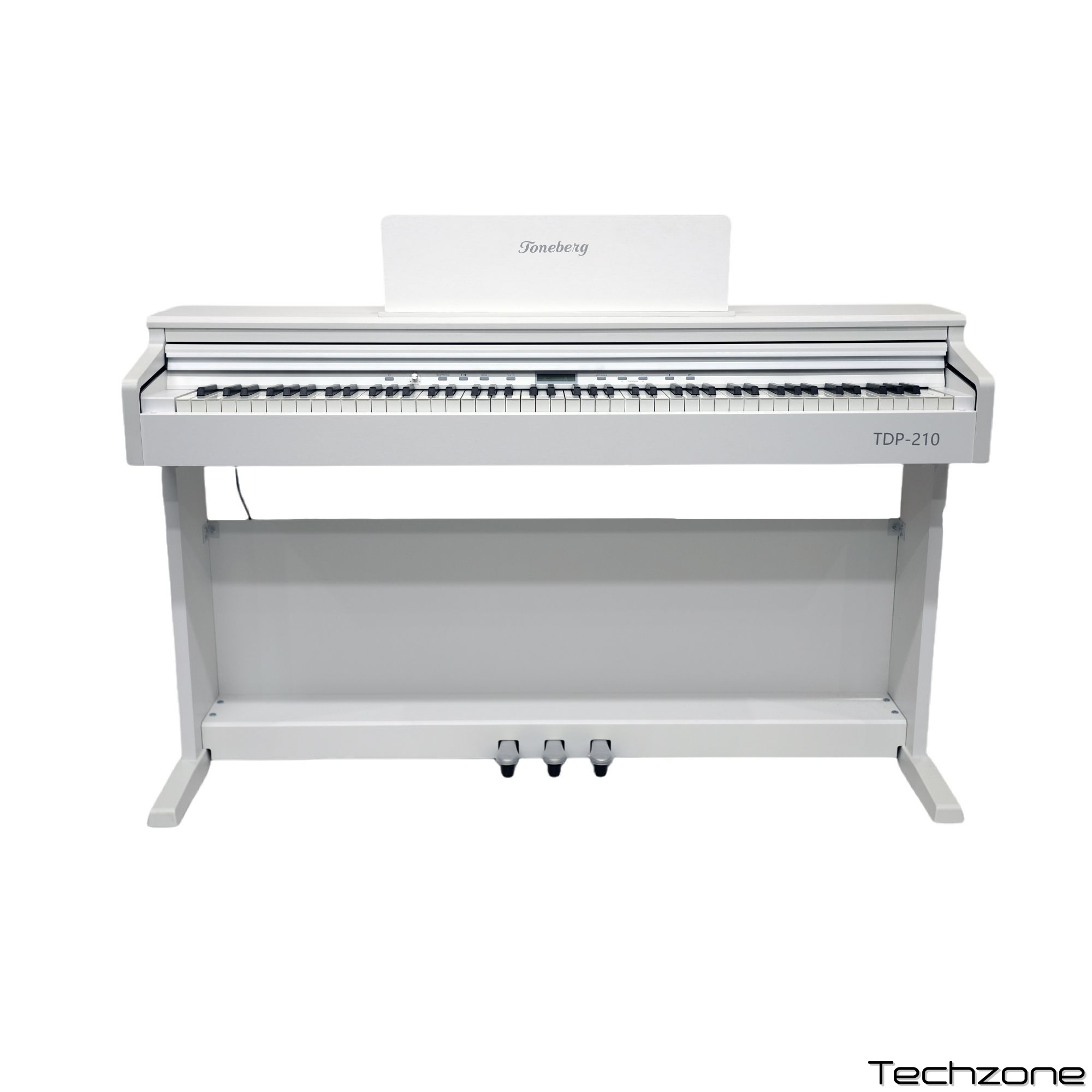 Технічні характеристики: Модель: Toneberg TDP-210 Клавіатура: 88 клавіш, молоточкова Звуковий модуль: France Dream 5716 Семплювання: Steinway digital stereo sampling Екран: багатофункціональний LED з підсвіткою Поліфонія: 128 голосів Тембри: 238 Ритми: 200 Демо-пісні: 100 MP3-плеєр: вбудований з незалежним керуванням Функції: вибір і комбінація тембрів, ритмів, демо, метроном, акорди, запис, транспонування, синхронізація, вставка, прелюдія та кода, подвійний тембр, подвійна клавіатура, хор, динаміка Інтерфейси: аудіовихід/вхід, USB-MIDI, USB-диск, подвійний вихід на навушники Педалі: три (sustain, sostenuto, soft) Стійка: дерев’яна.