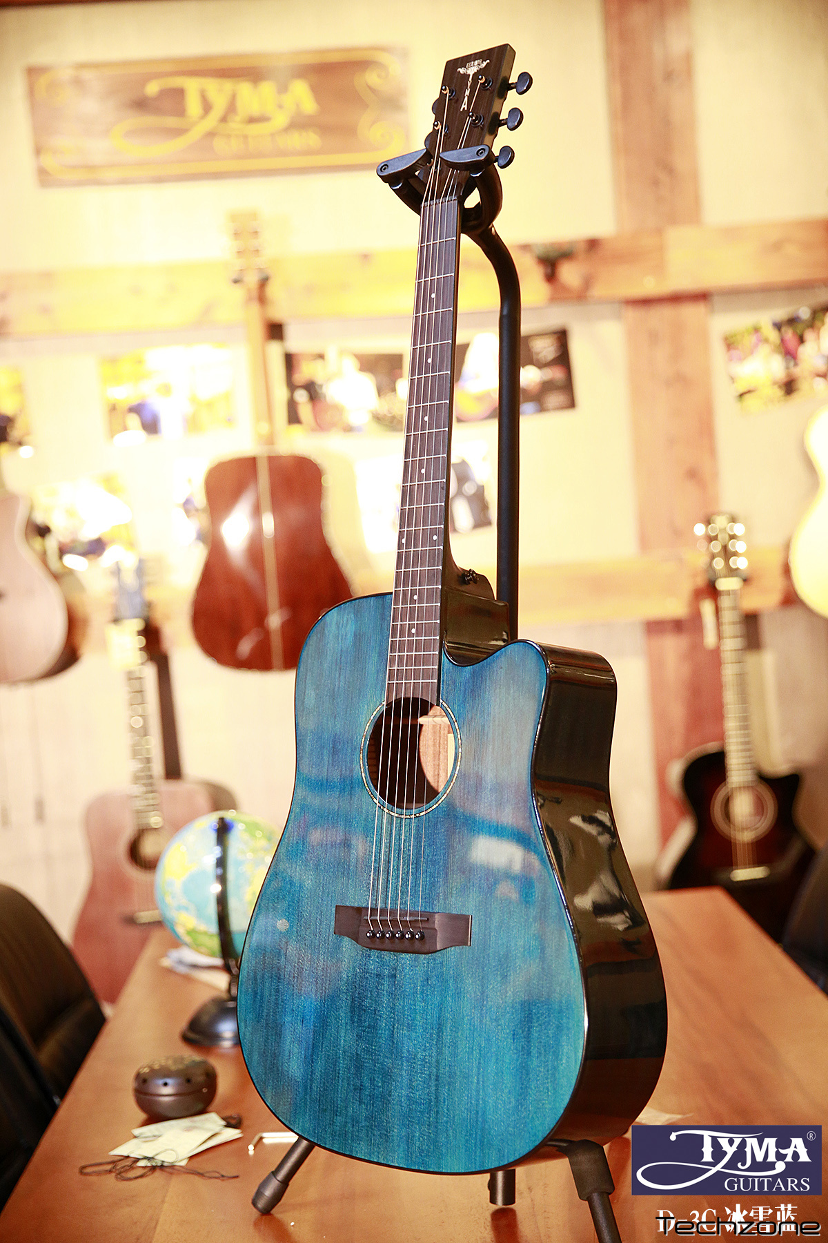 Електро акустична гітара. Тип корпусу: Dreadnaught Cutaway Верхня дека: Масив Ситхінська ялина Боковини і нижня дека: Червоне дерево Гриф: Червона дерево Брідж: Палісандр Накладка на гриф: Палісандр Ширина поріжка: 43 мм Механіка: хромовані Diecast Кількість ладів: 20 Мензура: 645 мм Електроніка: TYMA T200 Покриття: Глянцеве Колір: Блакитний прозорий. Чохол в комплекті.