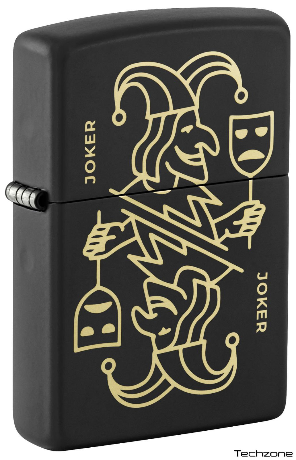 Витончений дизайн карти Джокера виблискує латунними відтінками на поверхні цієї класичної чорної матової запальнички з химерним дизайном лазерного гравірування. Постачається в подарунковій коробці. Для оптимальної роботи заправляйте пальним для запальничок Zippo.